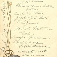 Menu manuscrit et publicitaire de l'Hôtel de l'Europe. Publicité commerciale : Liqueur du Père Kermann. Illustration : Nénuphar au-dessus d'un médaillon représentant le Père Kermann dans son laboratoire.
