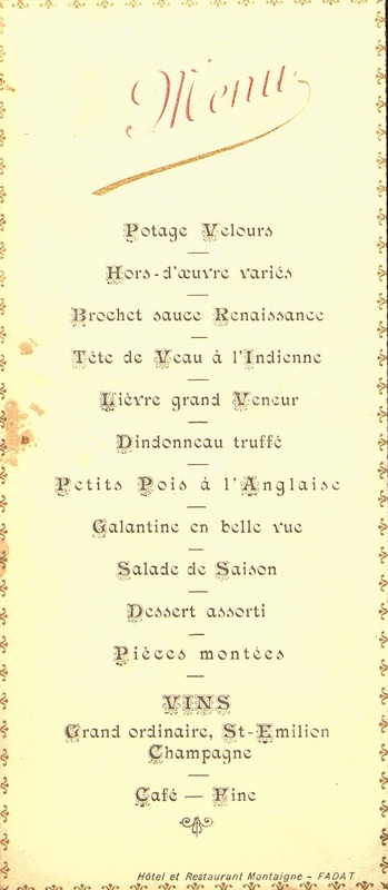 Menu de l'Hôtel-Restaurant Montaigne à Fadat (Quartier de Brive) au nom de Mme Peyroche.