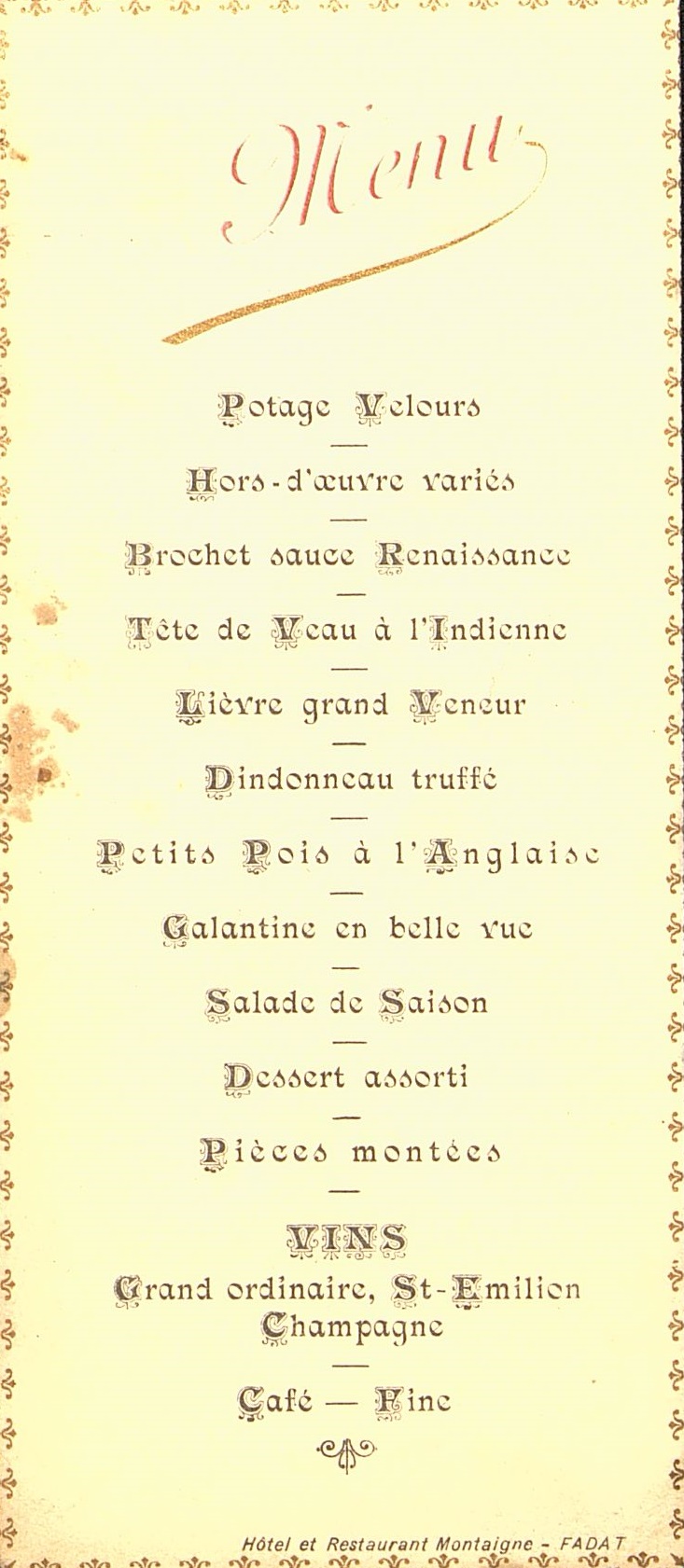 Vins : Grand ordinaire, St-Emilion, Champagne, Café, Fine.