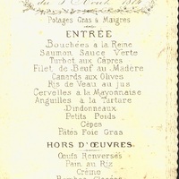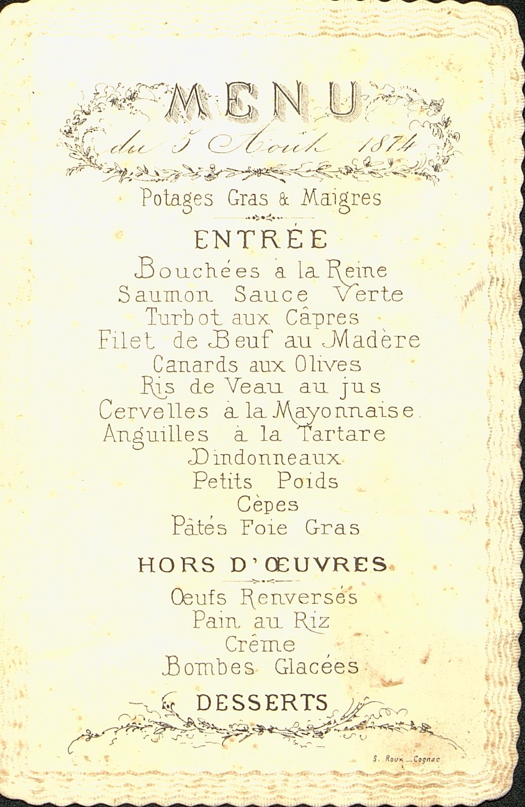 Potages Gras et Maigres ; Entrées ; Bouchées à la Reine ; Saumon sauce Verte ; Turbot aux Câpres ; Filet de Bœuf au Madère ; Canards aux Olives ; Ris de Veau au jus ; Cervelles à la Mayonnaise ; Anguilles à la Tartare ; Dindonneaux ; Petits poix ; Cèpes ; Pâtés Foie Gras ; Hors d’œuvres ; Oeufs renversés ; Pain au Riz ; Crème ; Bombes Glacées ; Desserts.