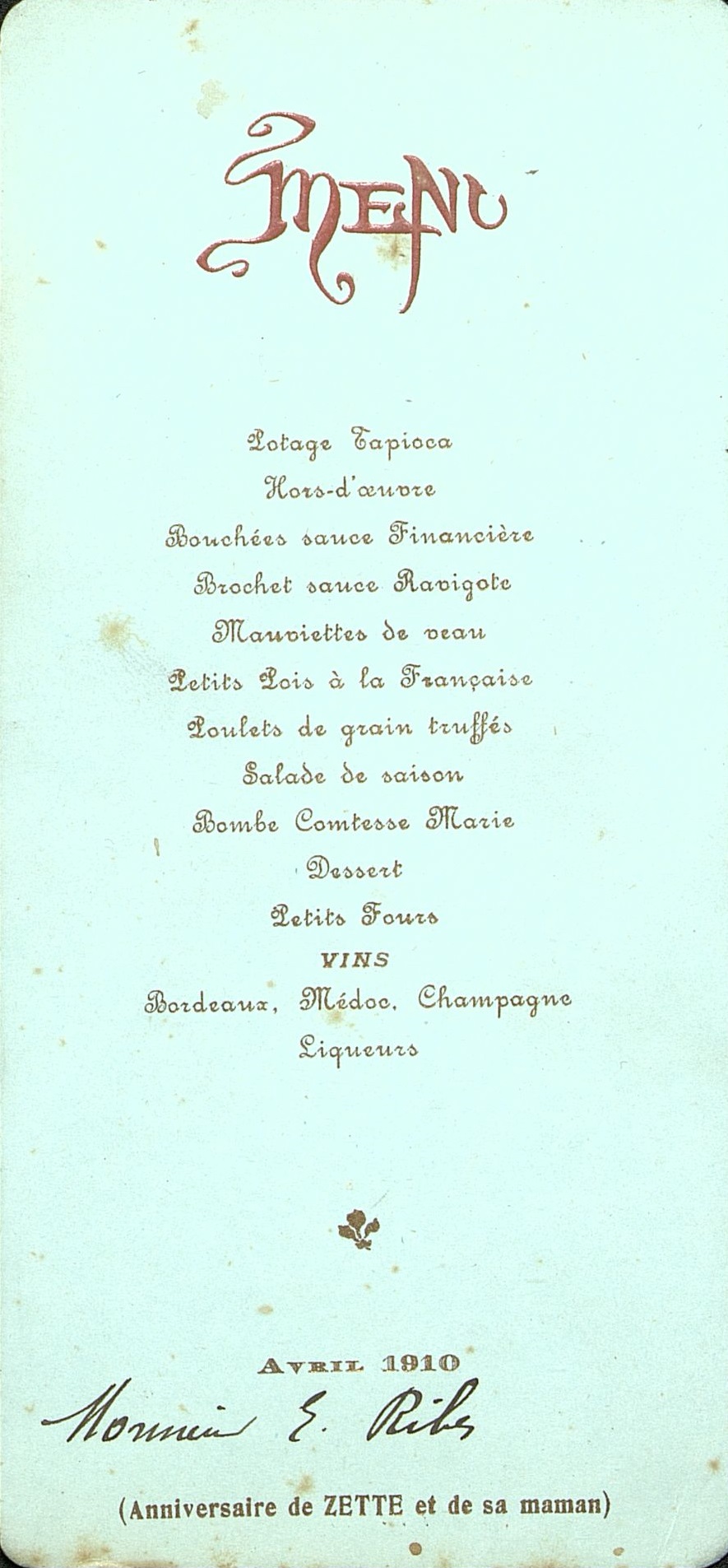 Menu de couleur bleue imprimé : en manuscrit, Monsieur Ribes.