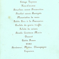 Potage Tapioca ; Hors d’œuvre ; Bouchées sauce Financière ; Brochet sauce Ravigote ; Mauviettes de veau ; Petits Pois à la Française ; Poulets de grain truffés ; Salade de saison ; Bombe Comtesse Marie ; Dessert ; Petits Fours.