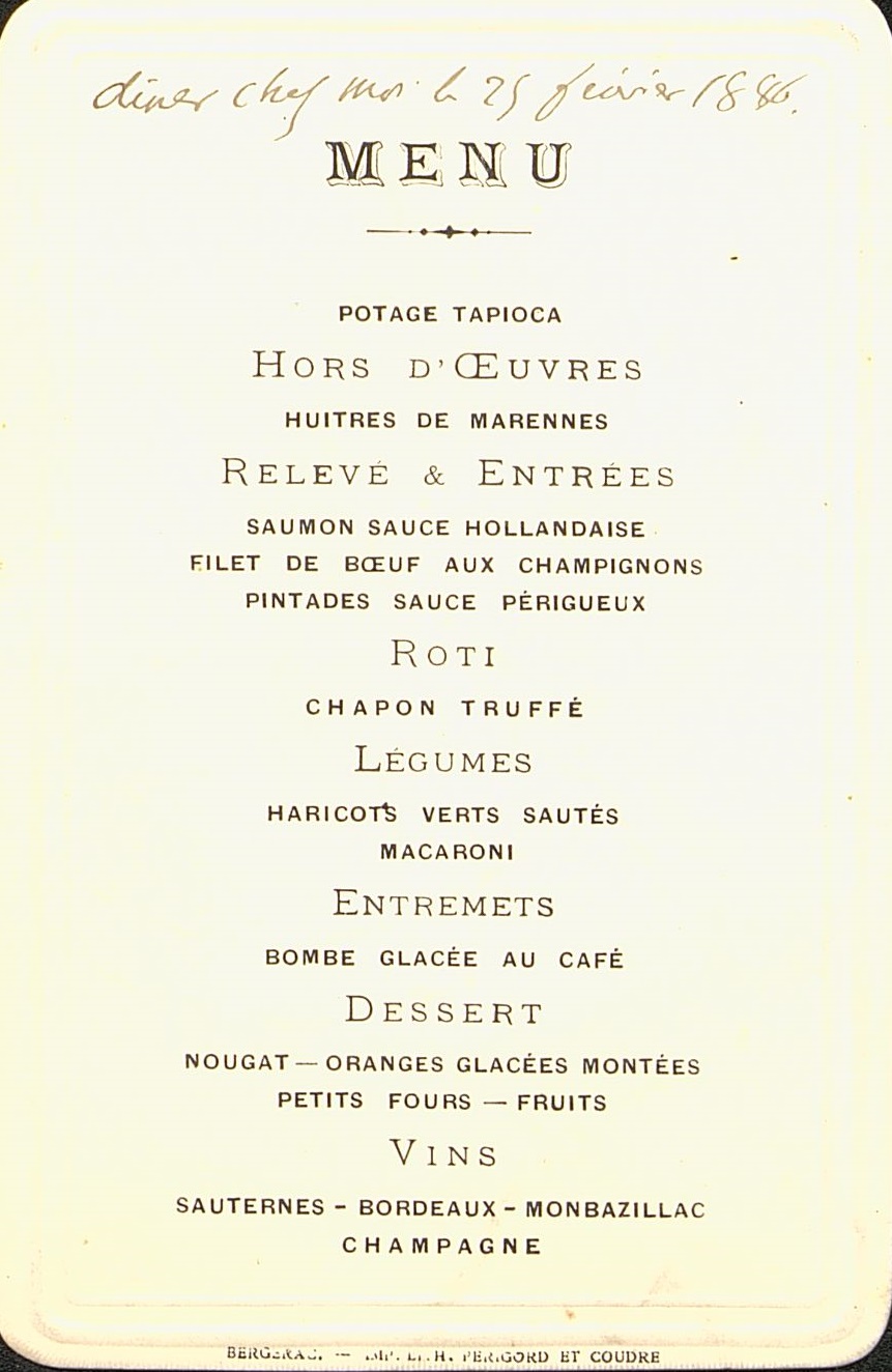 potage Tapioca ; Hors d’œuvres, Huitres de Marennes ; Relevé et Entrées : Saumon sauce Hollandaise, Filet de Bœuf aux Champignons, Pintades sauce Périgueux ; Rôti : Chapon truffé ; Légumes : Haricots verts sautés, Macaroni ; Entremets : Bombe glacée au café ; Dessert : Nougat, Oranges glacées montées, Petits fours, fruits.