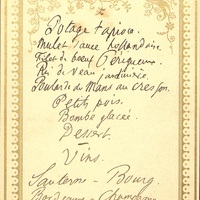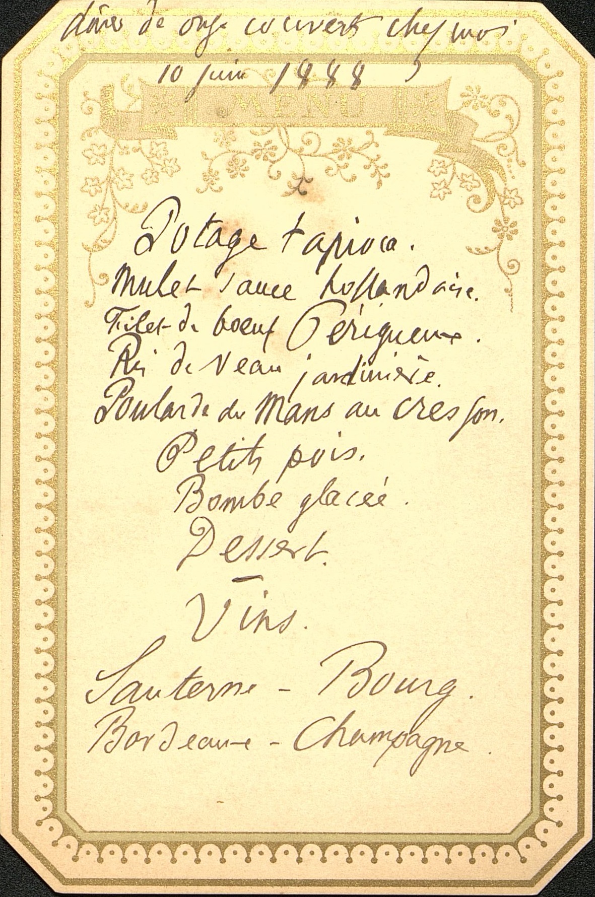 Potage Tapioca ; Mulet sauce Hollandaise ; Filet de Bœuf Périgueux ; Ris de veau jardinière ; Poularde du Mans au cresson ; Petits pois ; Bombe glacée ; Dessert.