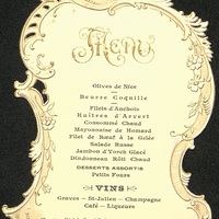 Olives de Nice ; Beurre Coquille ; Filet d'Anchois, Huitres d'Arvert ; Consommé Chaud ; Mayonnaise de Homard ; Filet de Bœuf à la Gelée ; Salade Russe ; Jambon d'York Glacé ; Dindonneau Rôti Chaud ; Desserts assortis ; Petits Fours.