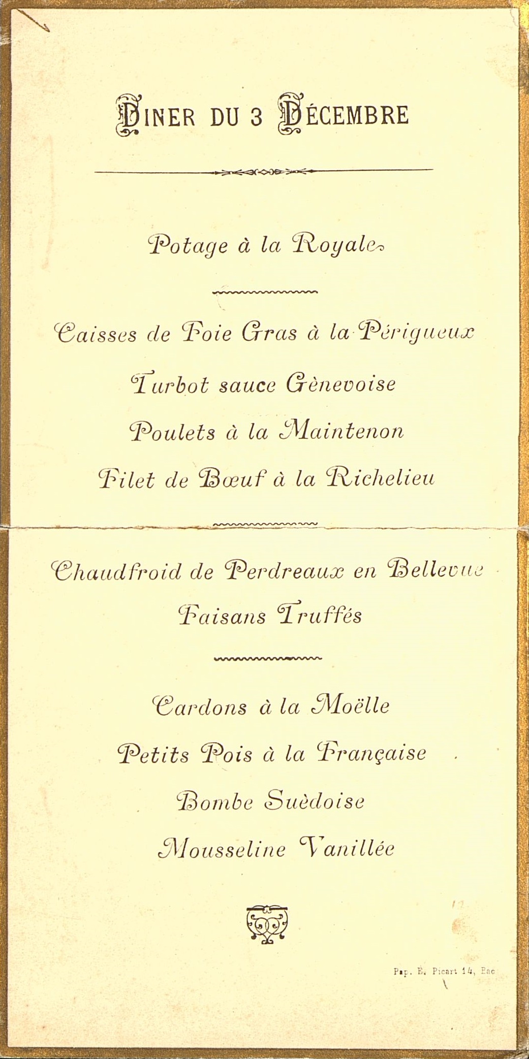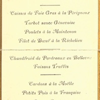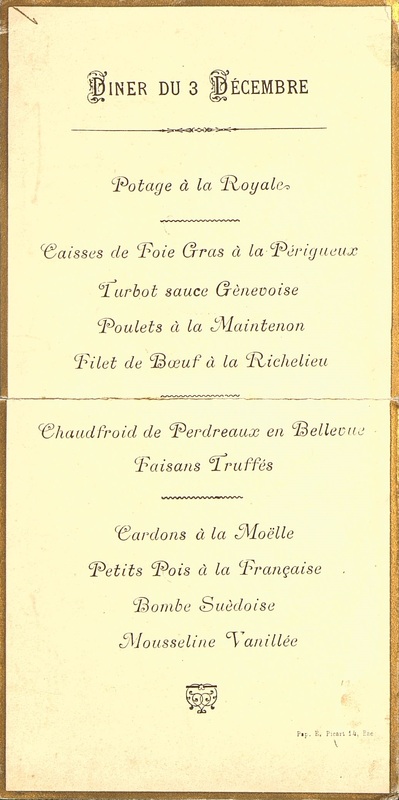 - Plats servis : Potage à la Royale. Caisse de Foie Gras à la Périgueux. Turbot sauce Gênevoise. Poulets à la Maintenon. Filet de Bœuf à la Richelieu. Chaudfroid de Perdreaux à la Bellevue. Faisans Truffés. Cardons à la Moëlle. Petits Pois à la Française. Bombe Suédoise. Mousseline Vanillée.