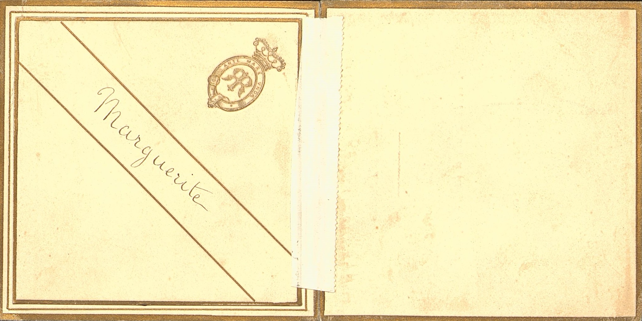 Menu pliant, en manuscrit Marguerite, daté du 3 décembre mais sans l'année. bordure liseré or. Ornement armorial : deus "R" accolés entourés d'une ceinture de cuir listel "Ante Mare Undae" surmonté d'une couronne royale .