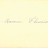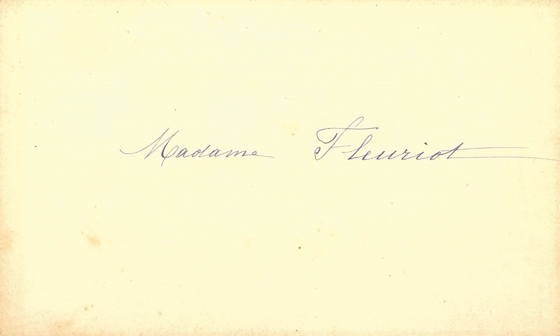 Menu manuscrit à l'encre violette pour Mme Fleuriot. Illustration : Entrelacs de feuillages bleus et gris avec œillets de même.