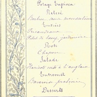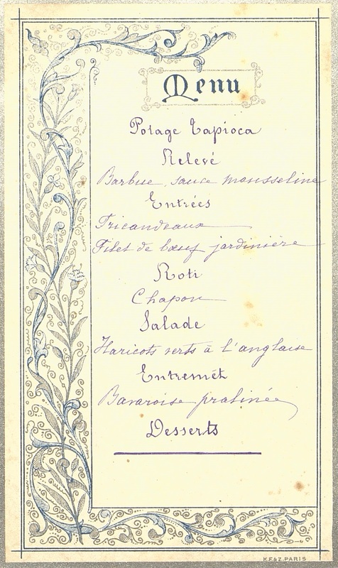 Plats servis : Potage Tapioca . Relevé : Barbue sauce Mousseline. Entrées : Fricandeaux. Filet de bœuf jardinière. Rôti : Chapon. Salade : Haricots verts à l'anglaise. Entremet : Bavaroise pralinée. Desserts.