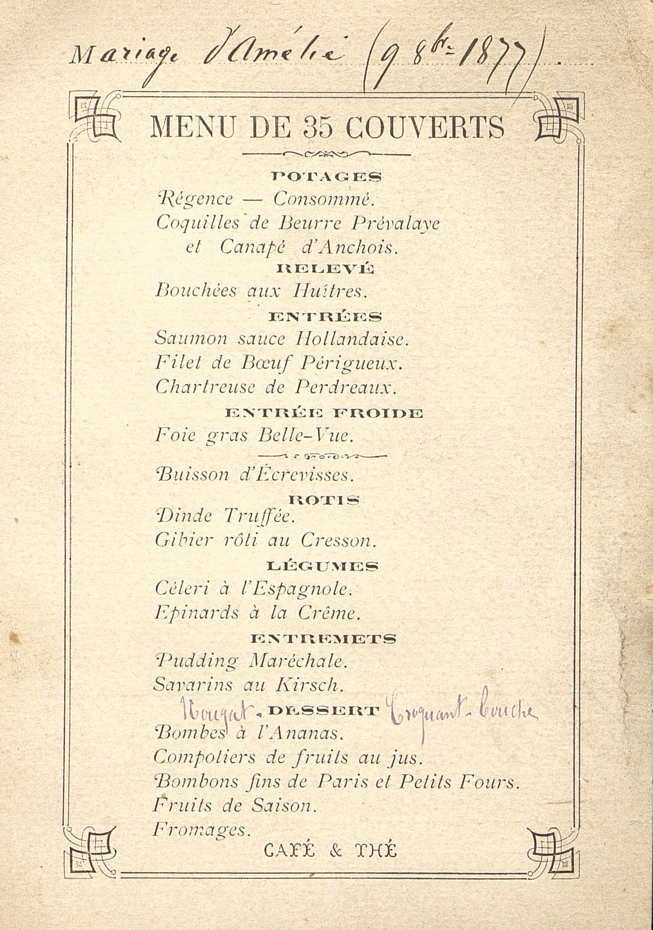 Menu titré en note manuscrite " Mariage d'Amélie…"