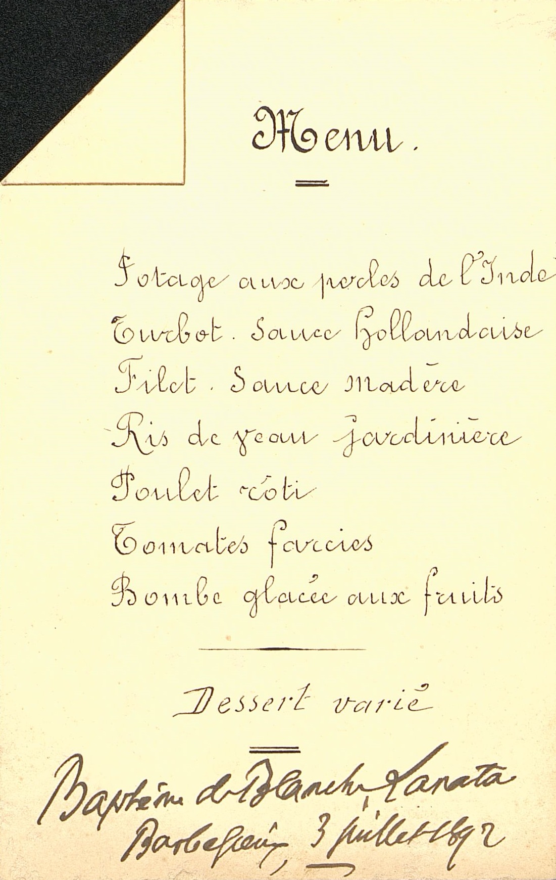 Menu manuscrit avec coin plié. Baptème de Blanche Lanata (?), Barbezieux, 3 juillet 1892. Au dos également en manuscrit Monsieur Pellisson.