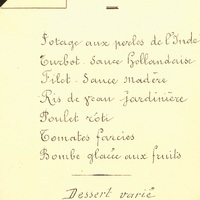 Plats servis : Potage aux perles de l'Inde. Turbot Sauce Hollandaise. Filet Sauce Madère. Ris de veau Jardinière. Poulet rôti. Tomates farcies. Bombe glacée aux fruits. Dessert varié.