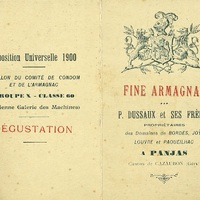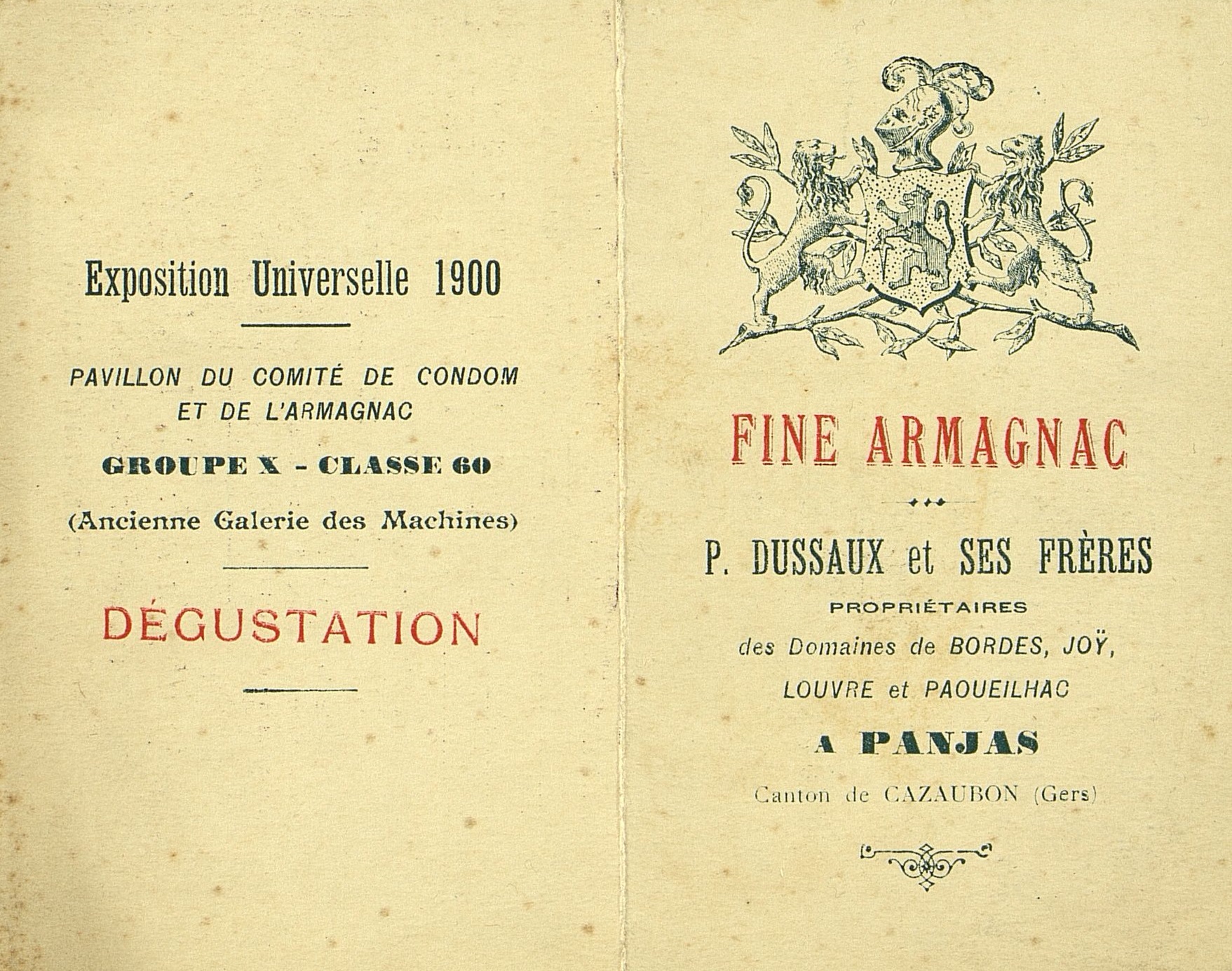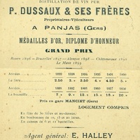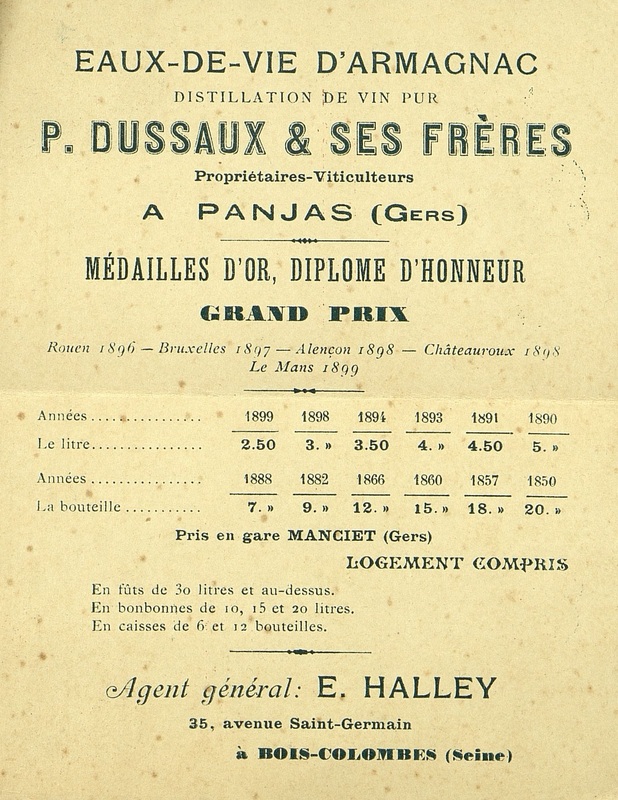 Dépliant publicitaire Fine Armagnac, P. Dussaux et ses frères propriétaires. Au dos les tarifs.