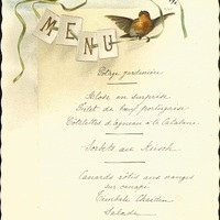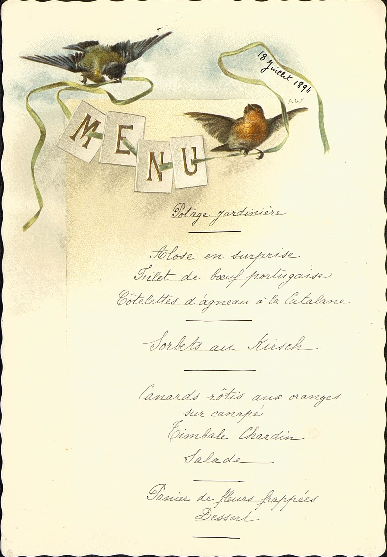 Menu illustré par deux oiseaux, un rouge gorge à droite et une mésange à gauche, tenant un ruban vert traversant des cartons de lettres capitales de MENU . Illustrateur A.W.