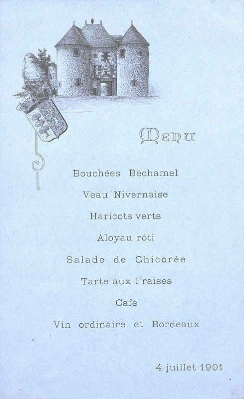 Bouchées Béchamel ; Veau Nivernaise ; Haricots Verts ; Aloyau rôti ; Salade de Chicorée ; Tarte aux Fraises ; Café ; Vin ordinaire et Bordeaux.