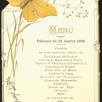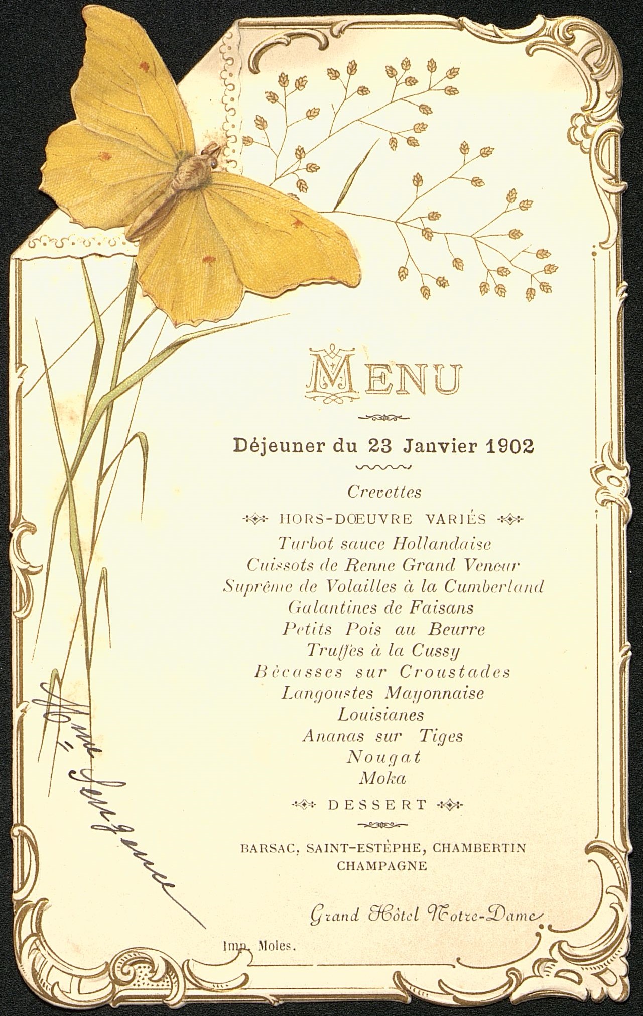 Plats servis : Crevettes. Hors d’œuvre variés. Turbot sauce Hollandaise. Cuissot de Renne Grand Veneur. Suprême de Volailles à la Cumberland. Galantine de Faisans. Petits Pois au Beurre. Truffes à la Cussy. Bécasses sur Croustades. Langoustes Mayonnaise. Louisianes. Ananas sur Tiges. Nougat. Moka. Dessert.
