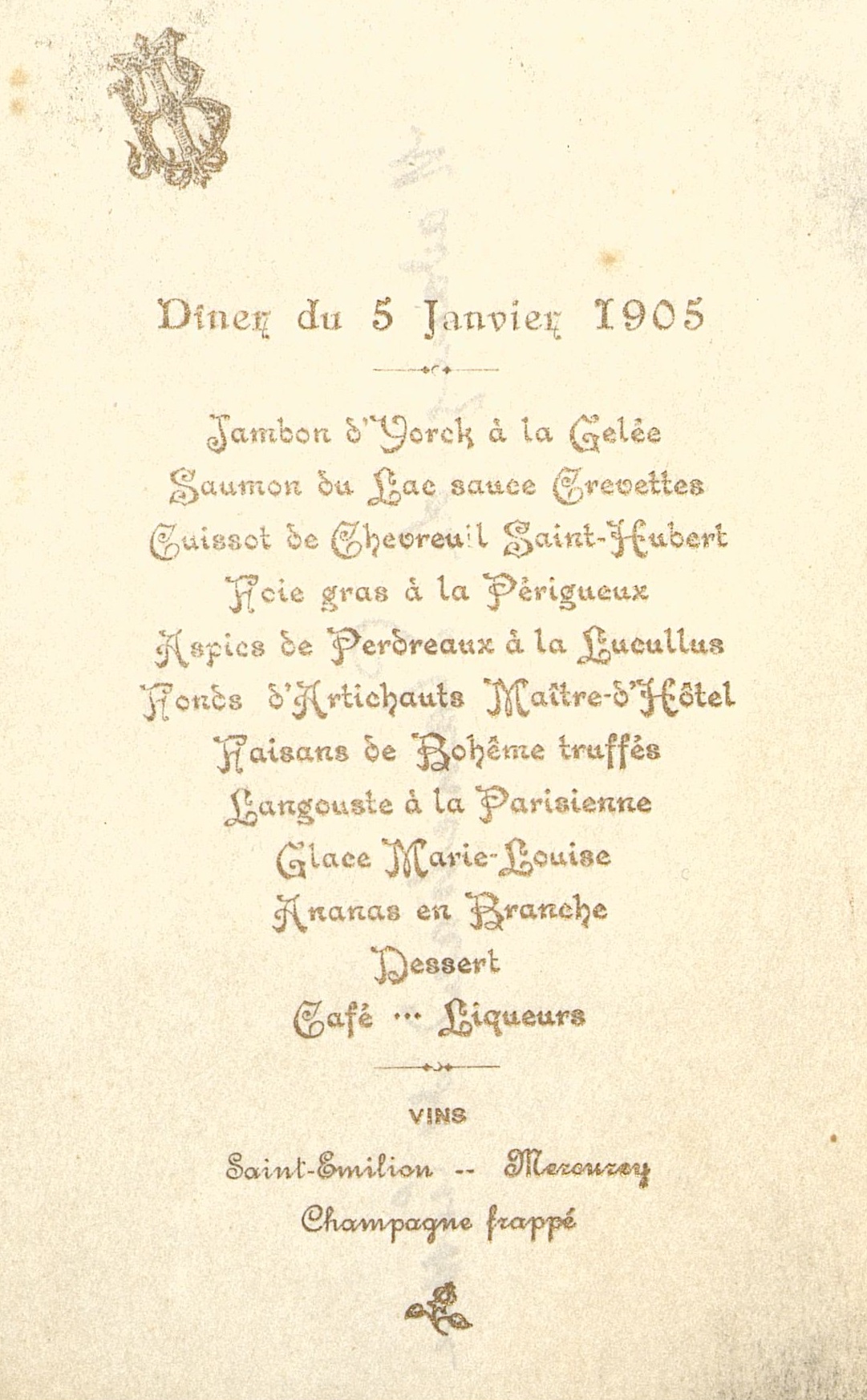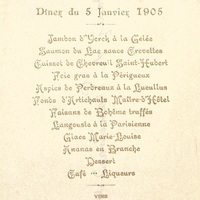 Dîner du 5 janvier 1905 portant au dos : Madame Planchard de Cussac. Initiales T B entrelacées.
