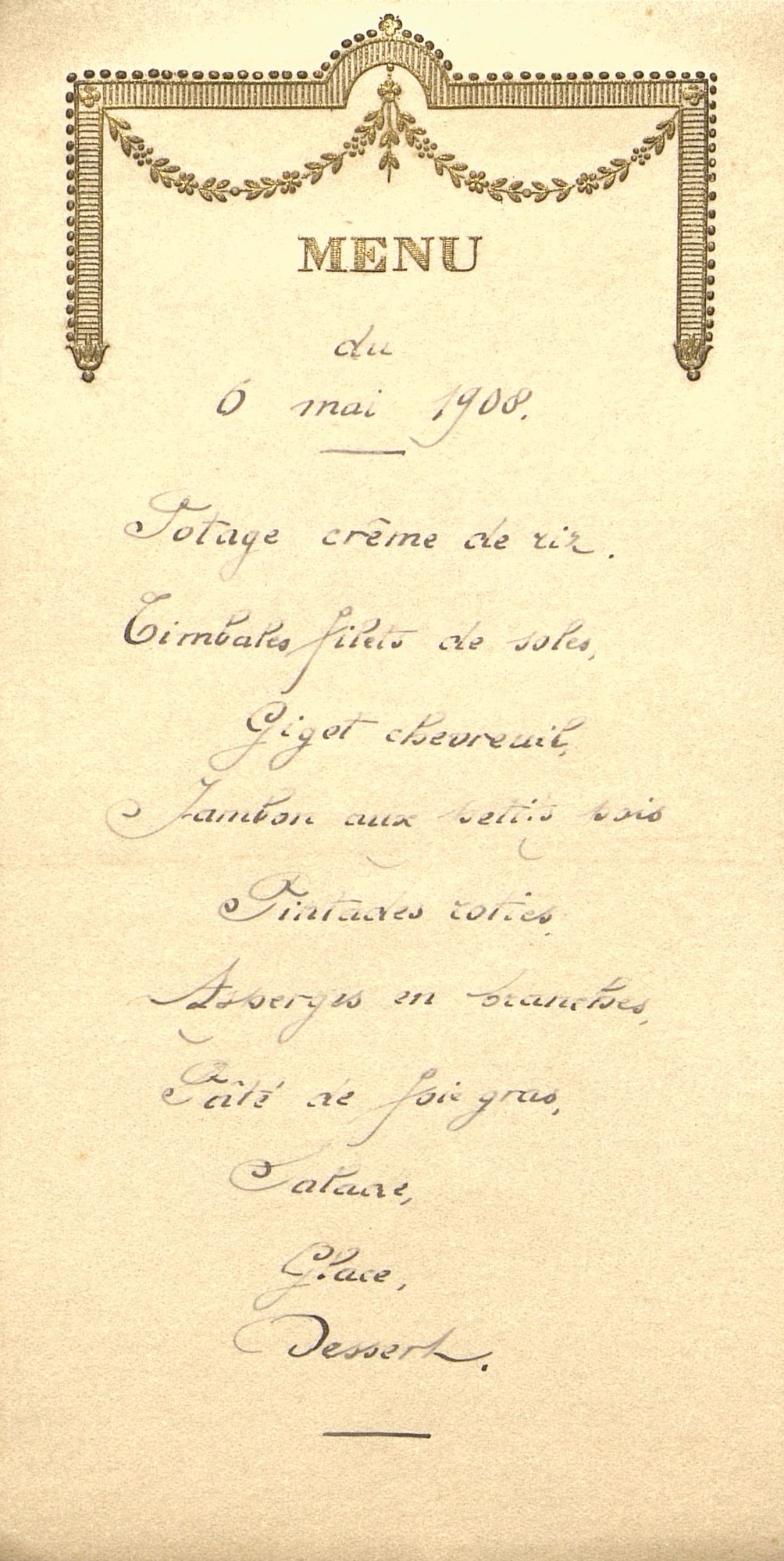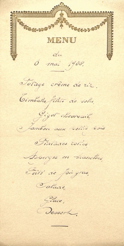 Plats servis : Potage crème de riz. Timbales filets de soles. Gigot chevreuil. Jambon aux petits pois. Pintades rôties. Asperges en branches. Pâté de foie gras. Salade. Glace. Dessert.