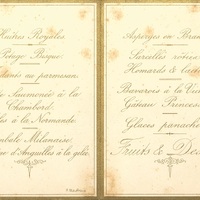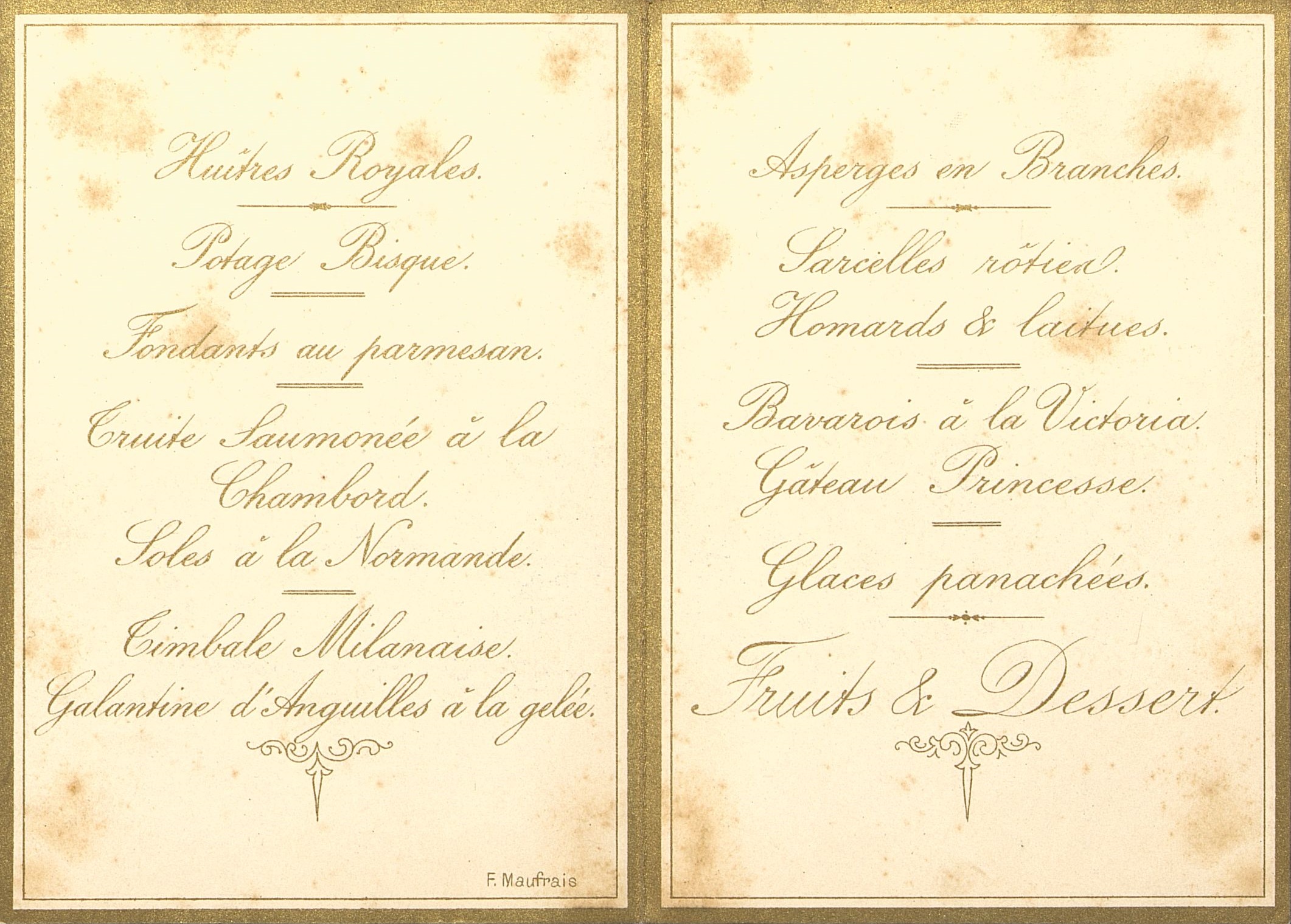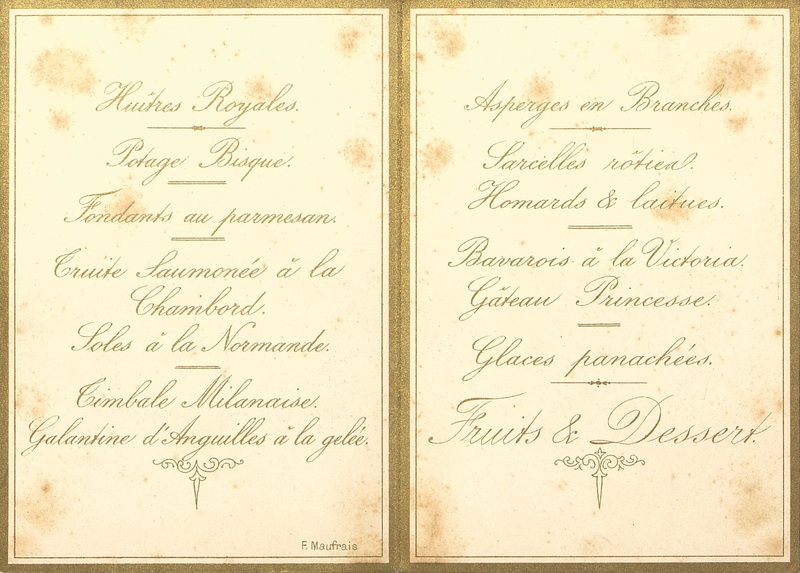Plats servis : Huîtres Royales. Potage Bisque. Fondants au parmesan. Truite Saumonée à la Chambord. Soles à la Normande. Timbale Milanaise. Galantine d'Anguilles à la gelée. Asperges en Branches. Sarcelles rôties. Homards et laitues. Bavarois à la Victoria. Gâteau Princesse. Glaces panachées. Fruits et Desserts.