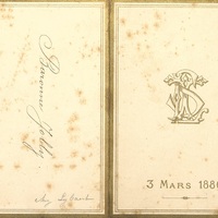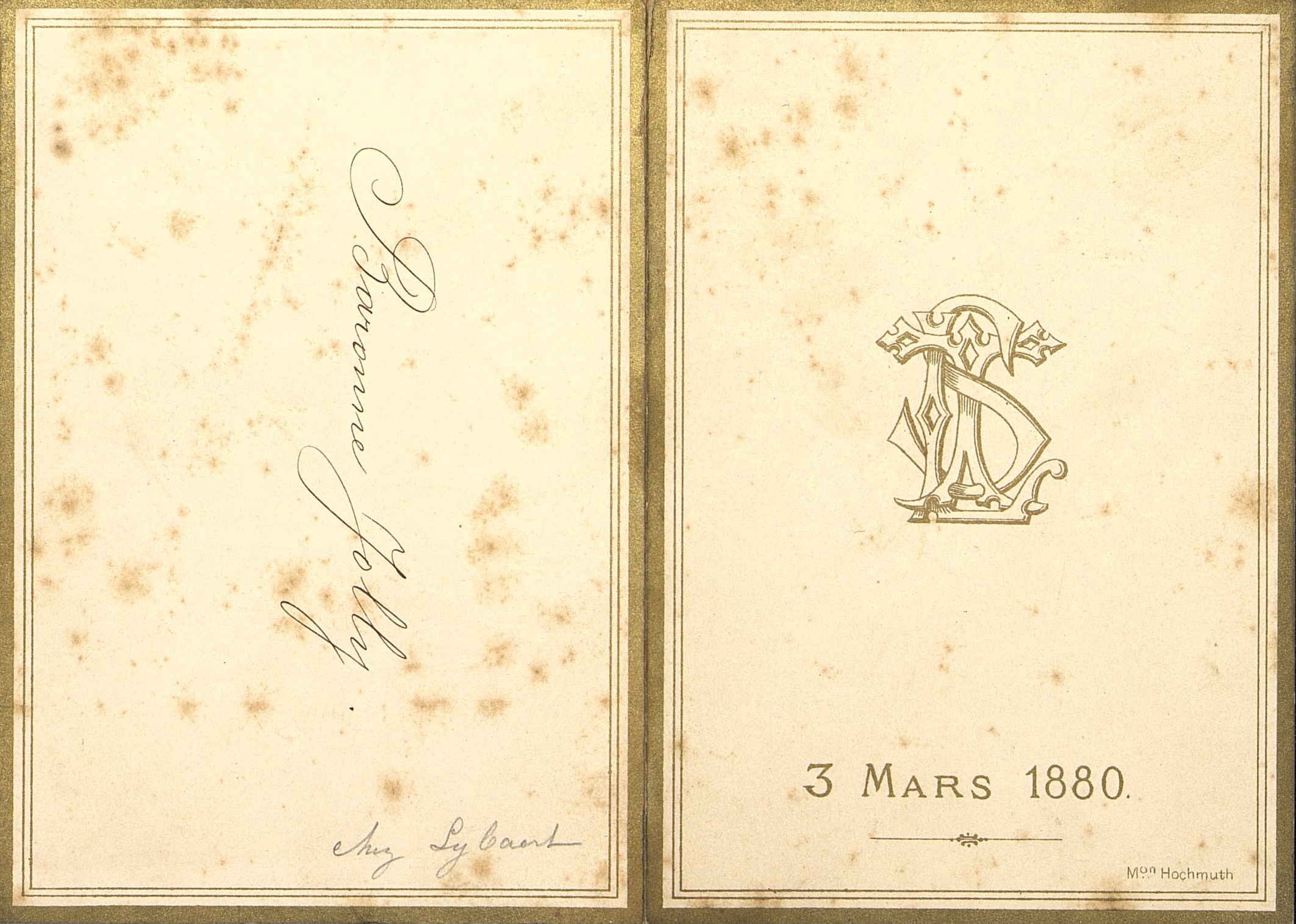 Menu pliant du 3 mars 1880. Monogramme L.T.S. : Au verso en note manuscrite : chez Lybaert.