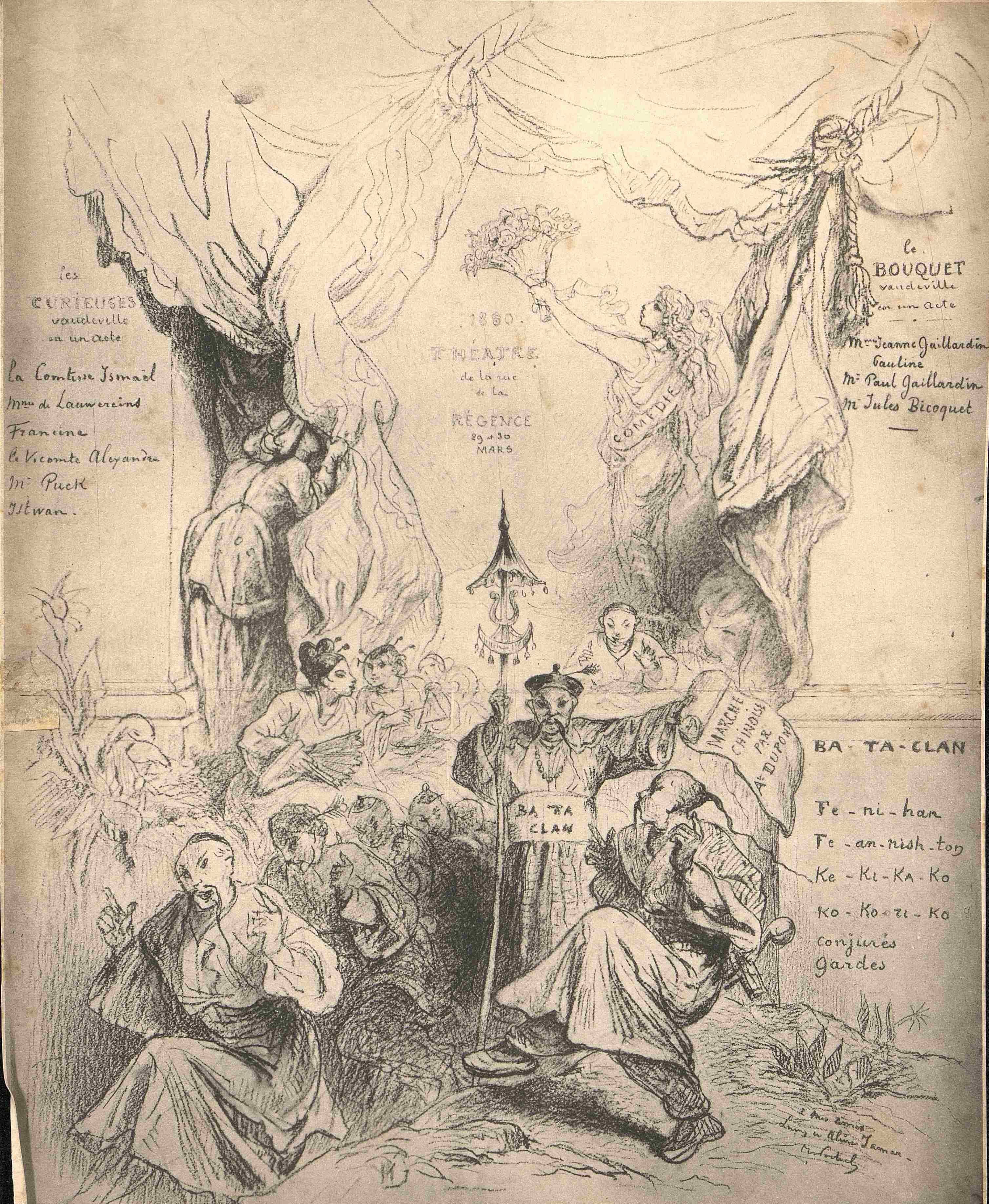 Publicité de mauvaise qualité du Théâtre de la rue de la Régence. Divers vaudevilles y sont présentés.