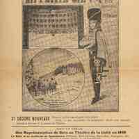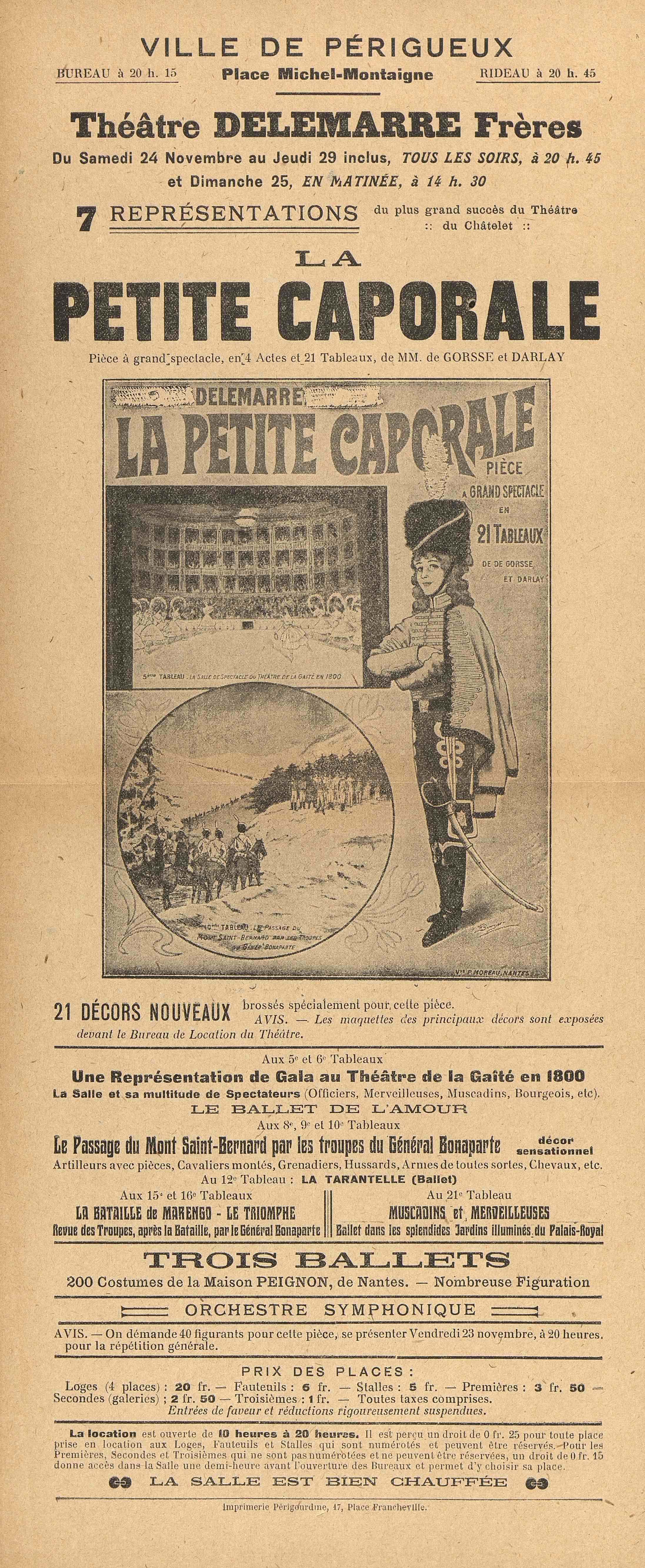 Affiche pour la pièce de théâtre : La Petite Caporale. Pièce en 4 actes et 21 tableaux jouée au Théâtre Delemarre Frères à Périgueux