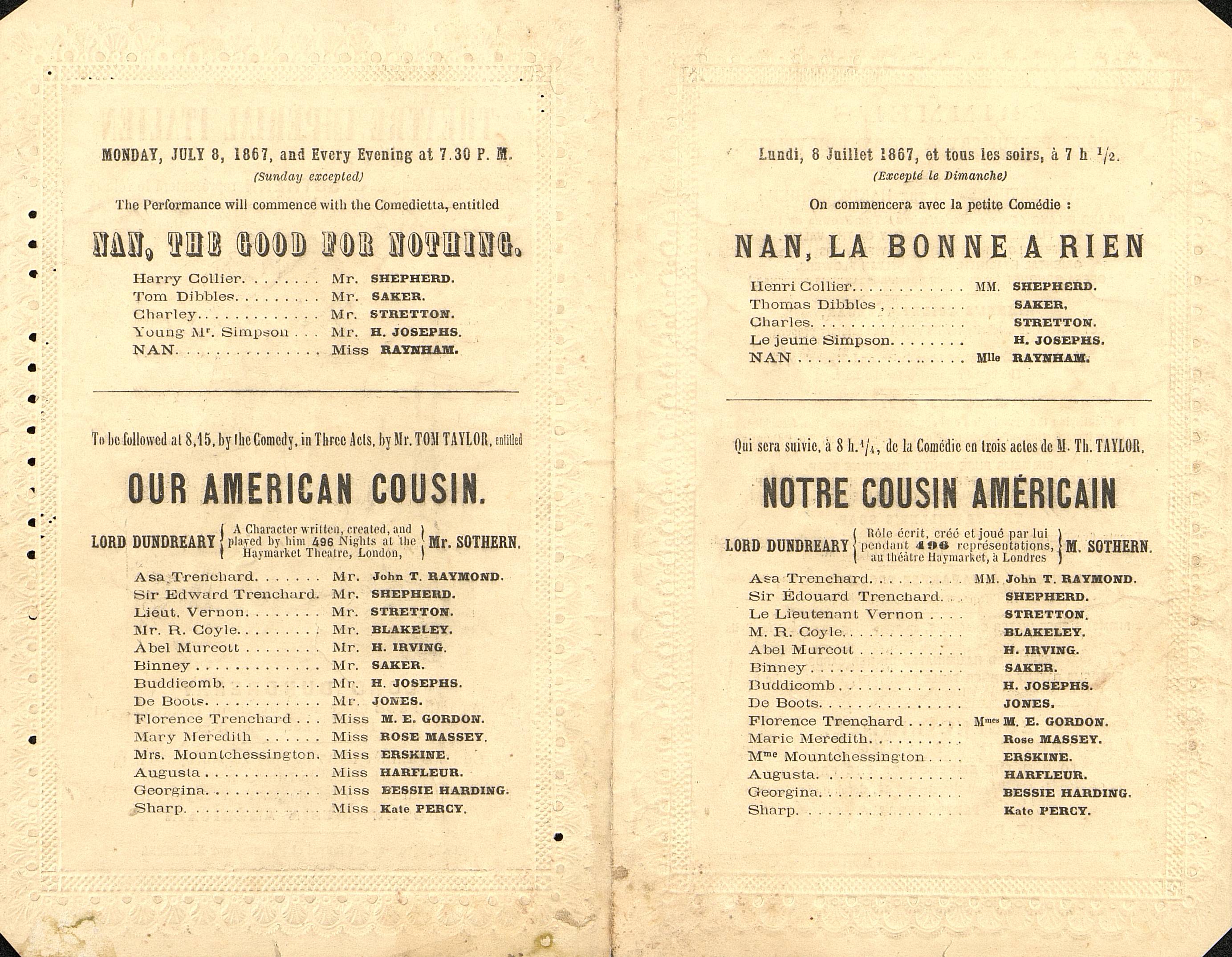 Our American Cousin (Notre cousin Américain), comédie en 3 actes.