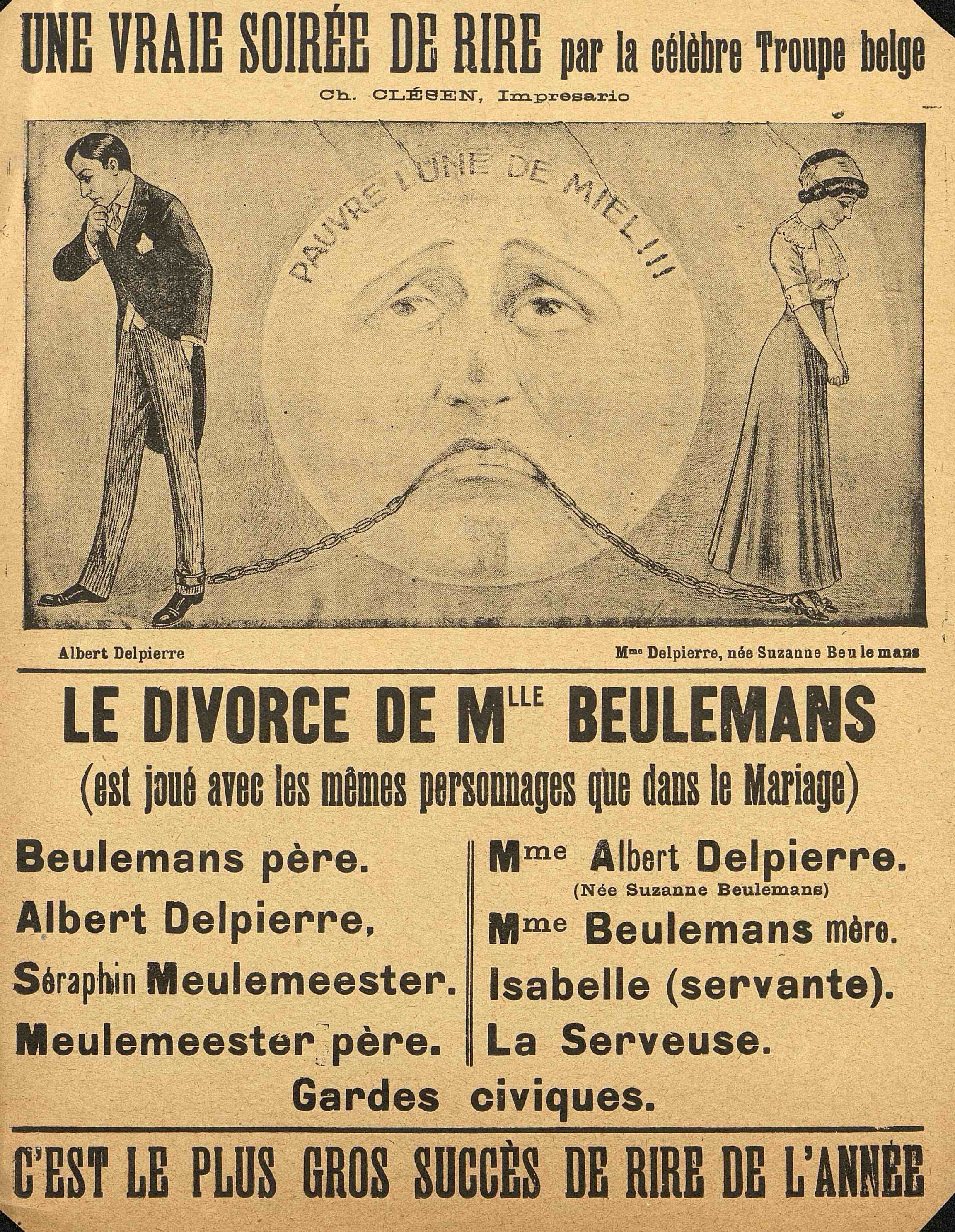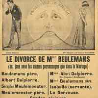 Affichette illustré de la pièce : "Le divorce de Mlle Beulemans". Sans date ni lieu. Troupe belge.