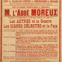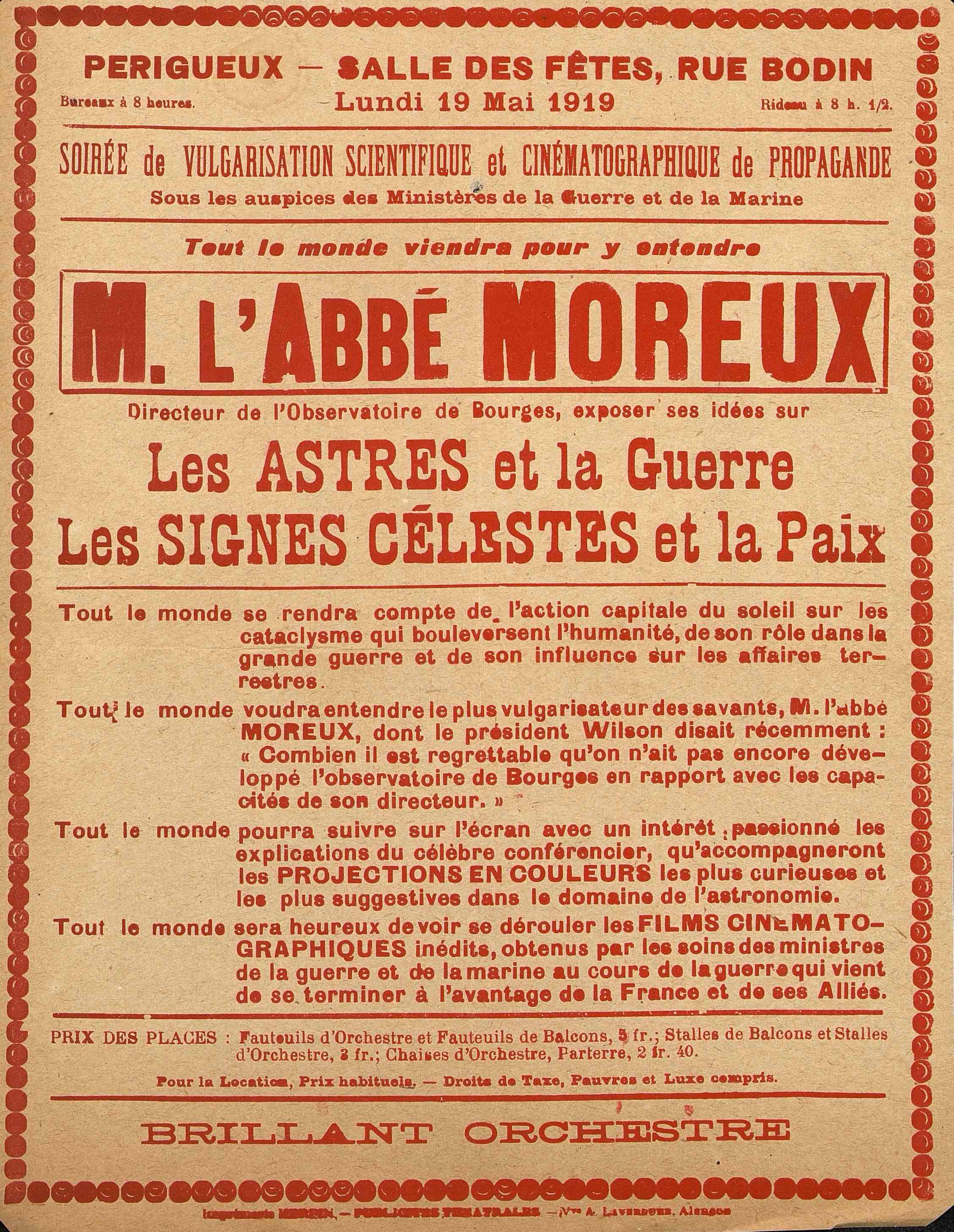 Affiche sur une conférence de M. l'Abbé Moreux, directeur de l'observatoire de Bourges sur "Les Astres et la Guerre. Les Signes célestes de la Paix". à la Salle de Fêtes de Périgueux le 19 mai 1919.