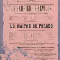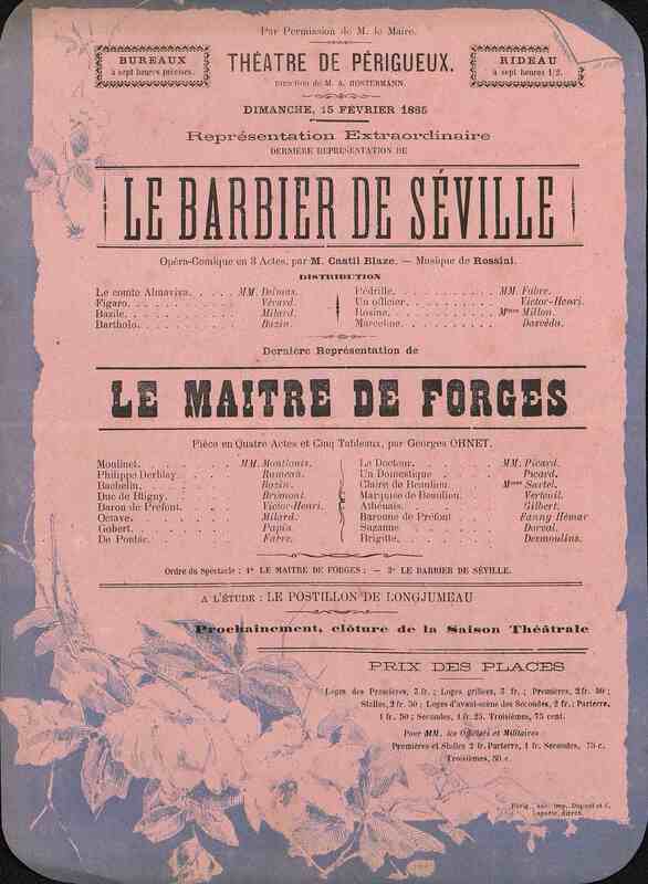 Publicité pour la pièce de théâtre : Le Barbier de Séville (3 actes), jouée à Périgueux en son théâtre le 15 février 1885, ainsi que Le Maître de Forges (4 actes).