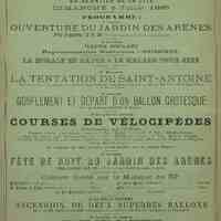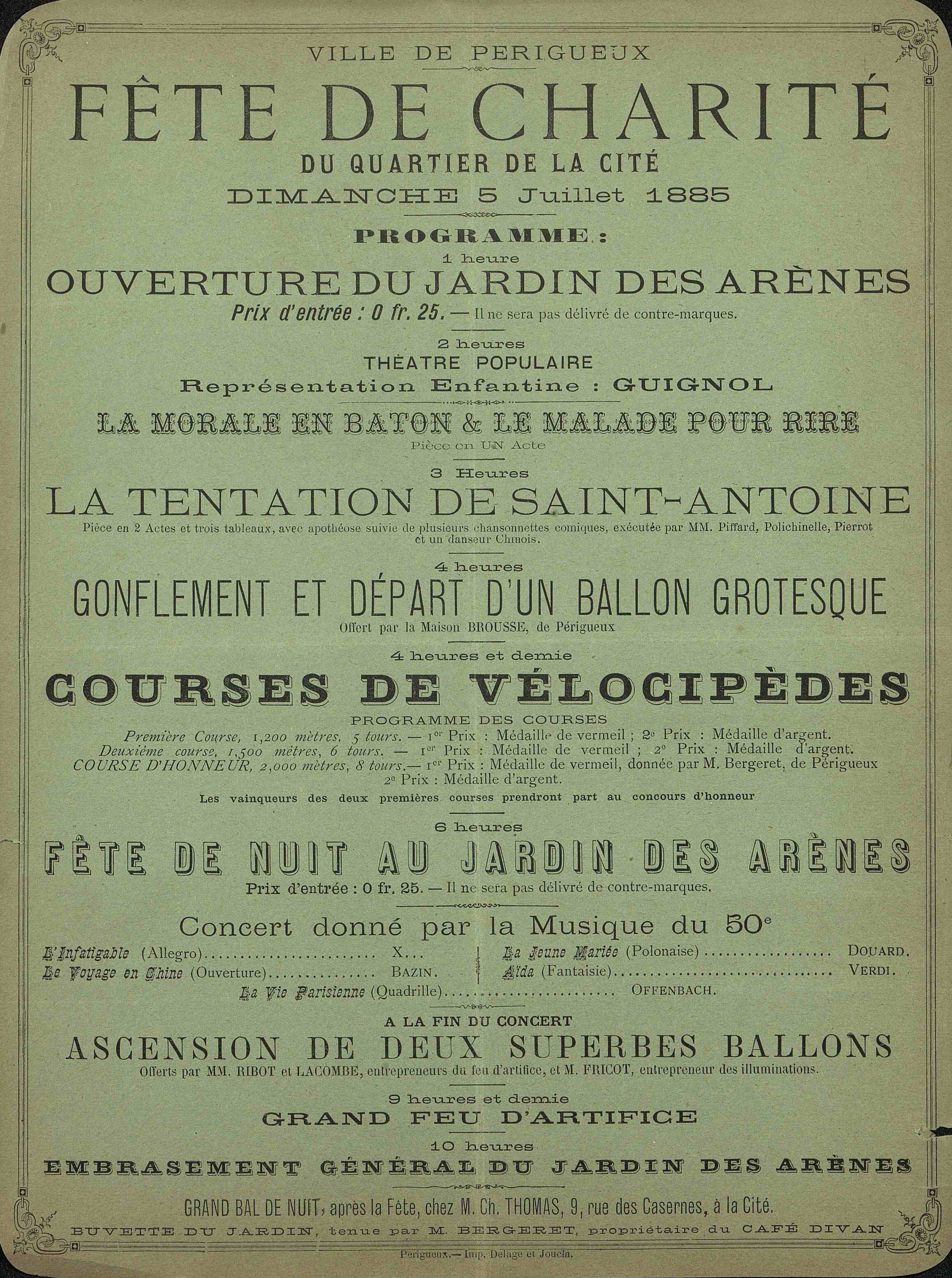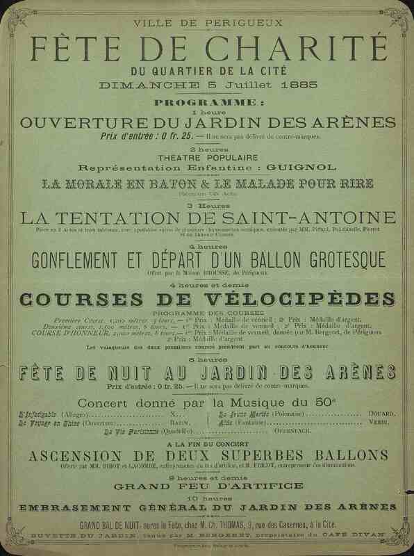 Programme Fête de charité du quartier de la Cité : ouverture du jardin des Arènes à 13 heures. A 14 heures : Théâtre populaire . Représentation enfantine : Guignol. La morale en bâton et le malade pour rire : pièce en un acte . A 15 heures : La tentation de Saint-Antoine : pièce en deux actes et trois tableaux. A 16 heures : gonflement et départ d'un ballon grotesque offert par la Maison Brousse de Périgueux. A 16 heures 30 : Course de vélocipèdes. Fêtes de nuit au jardin des Arènes. Concert donné par la musique du 50ème Régiment d'Infanterie avec l'"Infatigable" (Allegro), Le Voyage en Chine : Ouverture / de Bazin, comp. La Jeune mariée : Polonaise / de Douard, comp. Aïda : Fantaisie / de Verdi. La Vie parisienne: Quadrille / Offenbach.