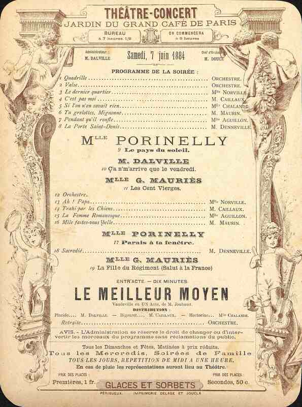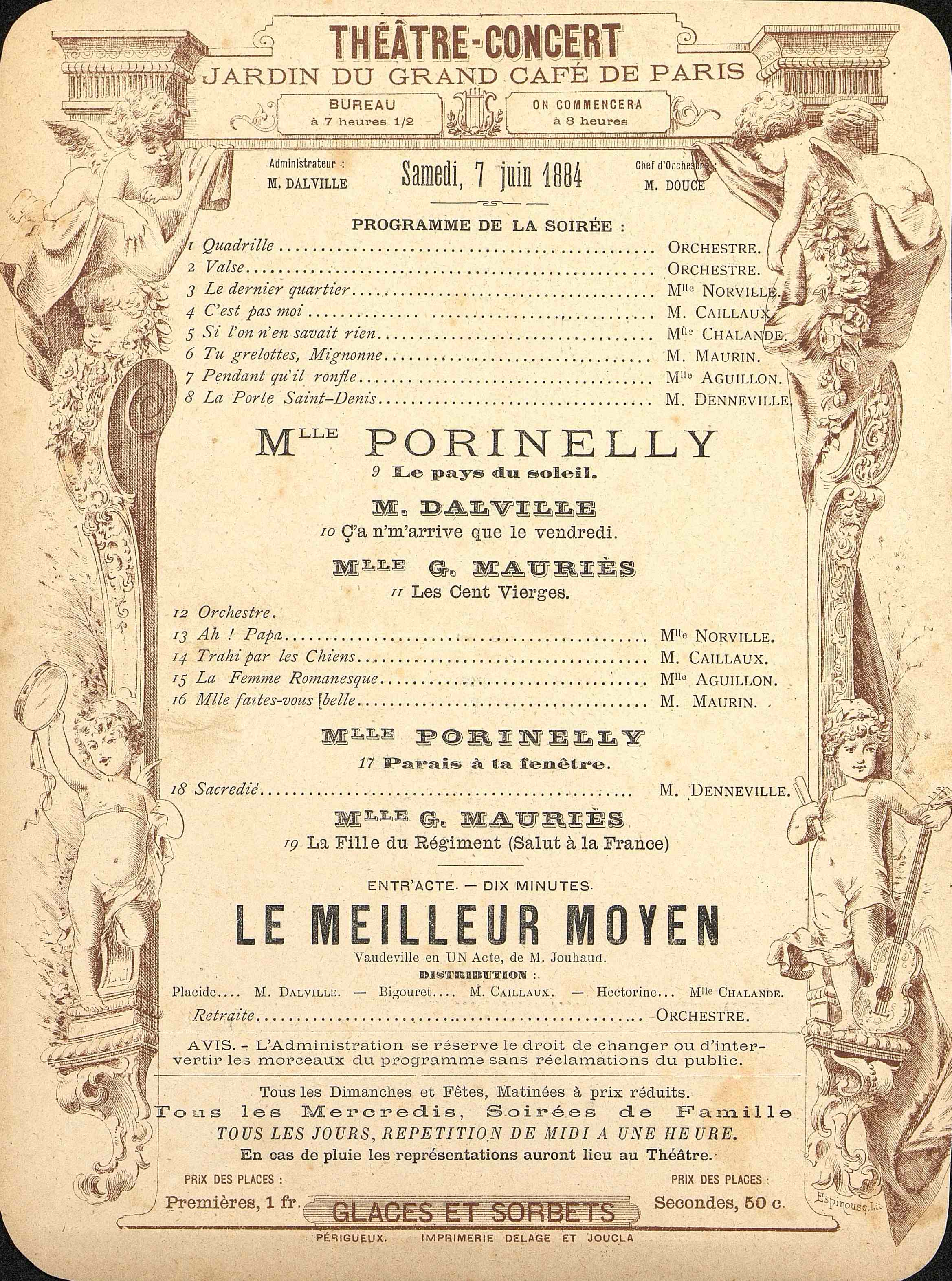 Programme du Théâtre Concert, jardin du Grand Café de Paris en date du 7 juin 1884. Musiques avant le vaudeville en un acte de M. Jouhaud : Le Meilleur Moyen.