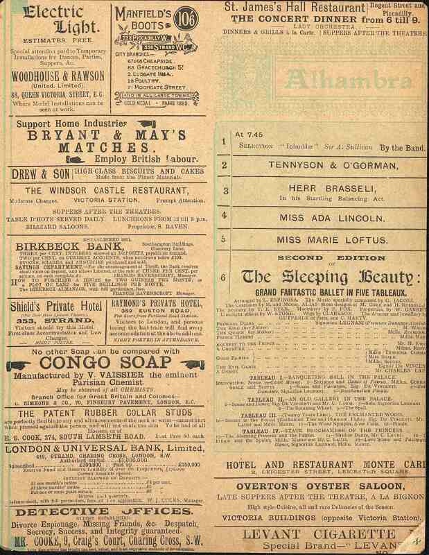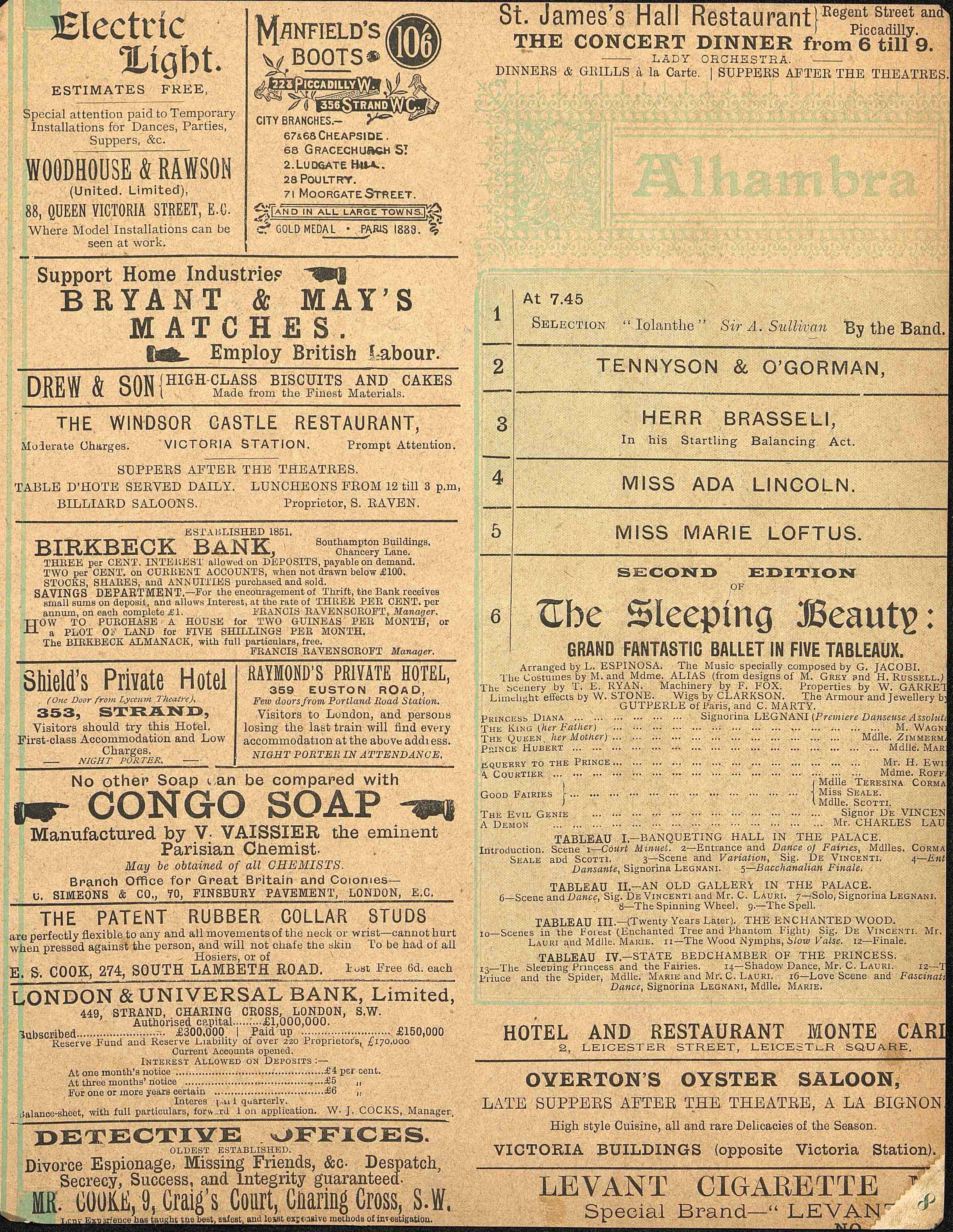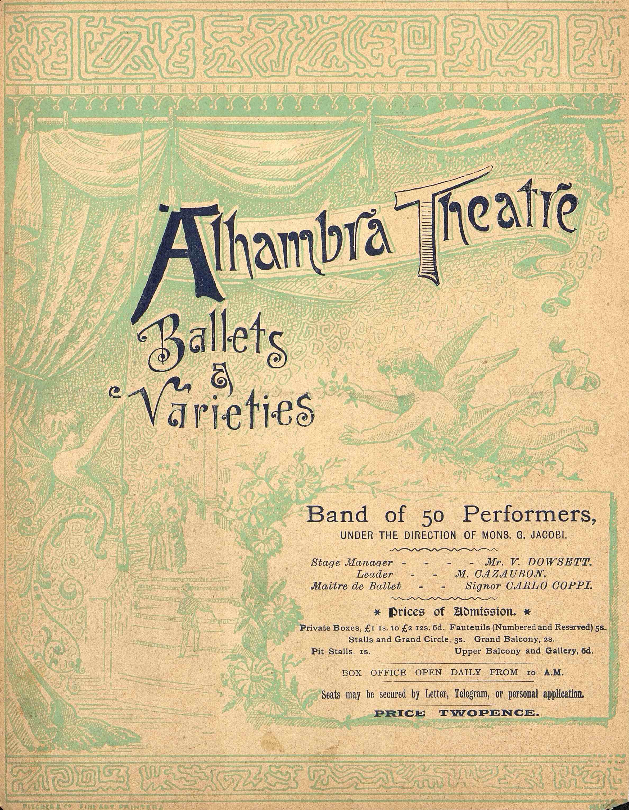 Alhambra Théâtre. Ballet and Varieties. Document illustré et découpé dans une revue. Spectacle : The Sleeping Beaury, non daté. Ce théâtre est aujourd'hui détruit.