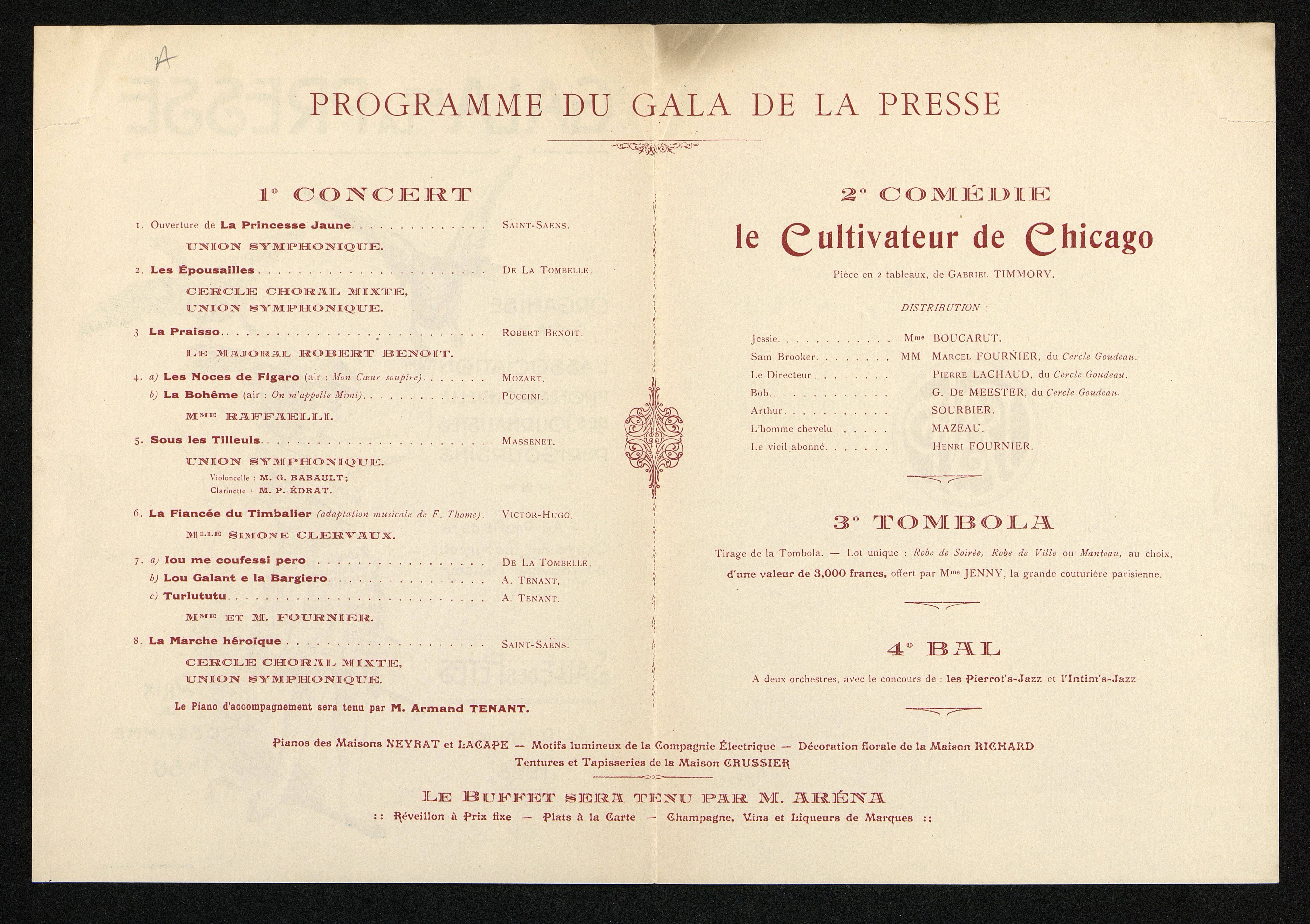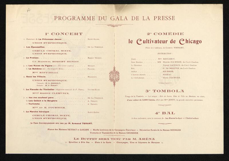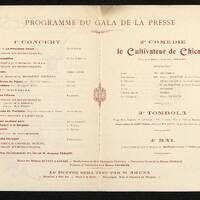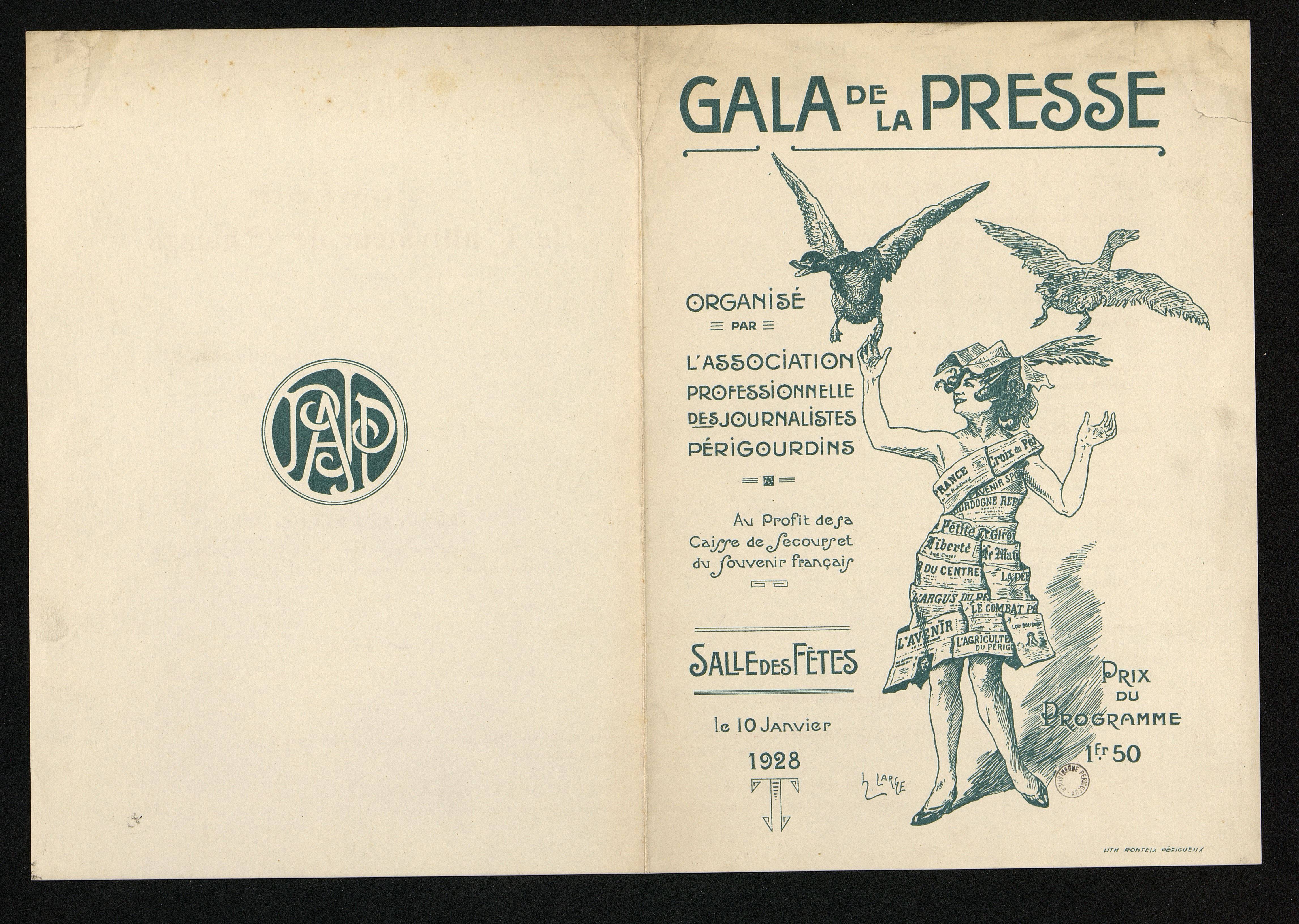 Programme du Gala de la presse, organisé par l'Association Professionnelle des Journalistes Périgourdins. salle des Fêtes de périgueux le 10 janvier 1928. Dépliant.