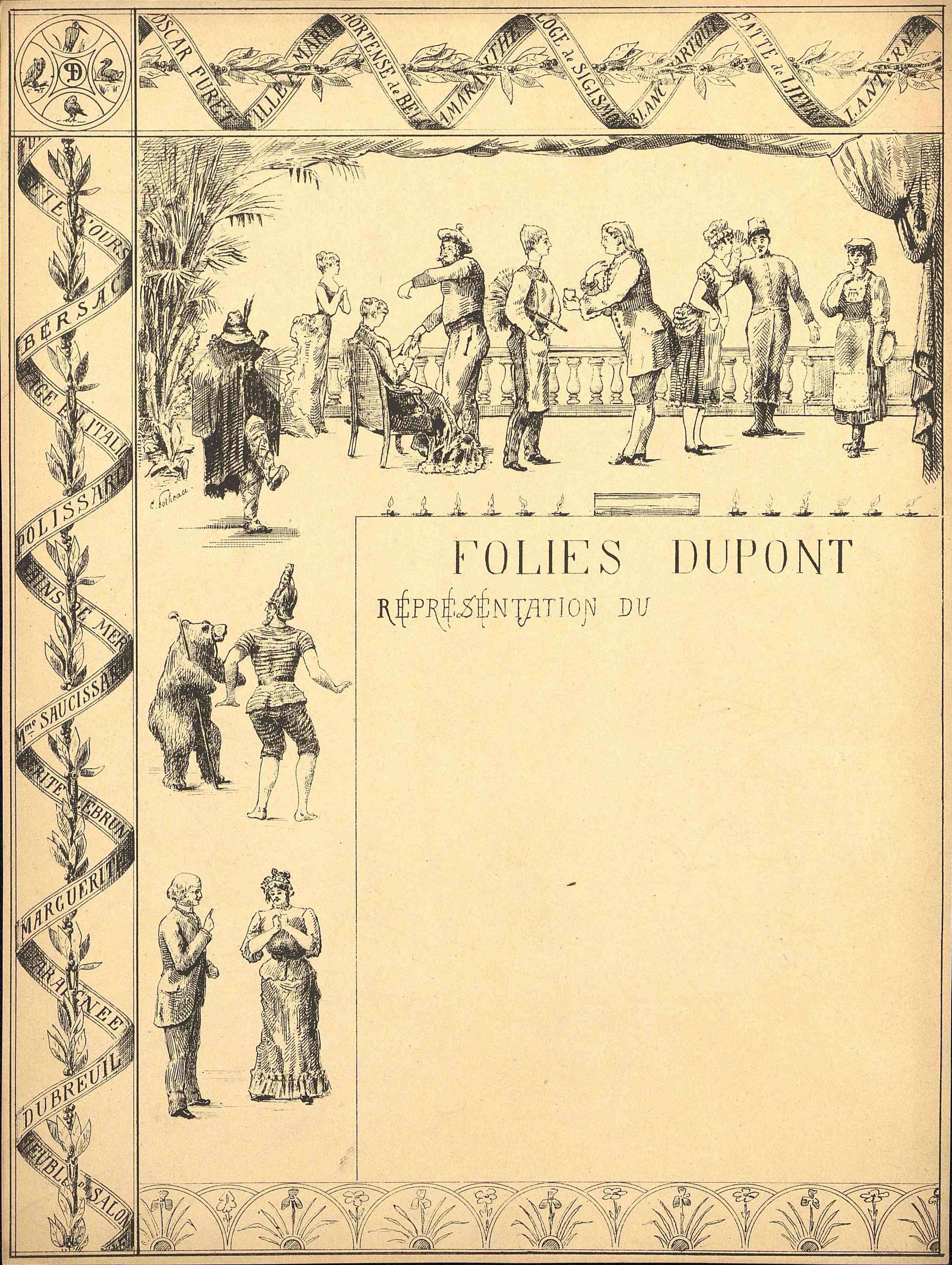 Programme vierge illustré : Folies Dupont . Dubreuil. Marguerite l'Araignée. Marguerite Lebrun. Mme Saucissard. Bains de mer. Polissard. Voyage en Itatlie. L'Eté d'ours. Fut..Oscar Furet. Fille à marier. Hortense de Belcamaranthe (sic). Loge de Sigismond. Blanc partout. Patte de Lièvre . I. Anterno.