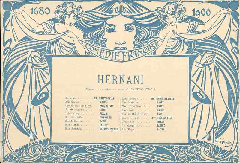 Illustration : Muse du Théâtre accompagnée de deux nymphes fleuries tenant un phylactère.