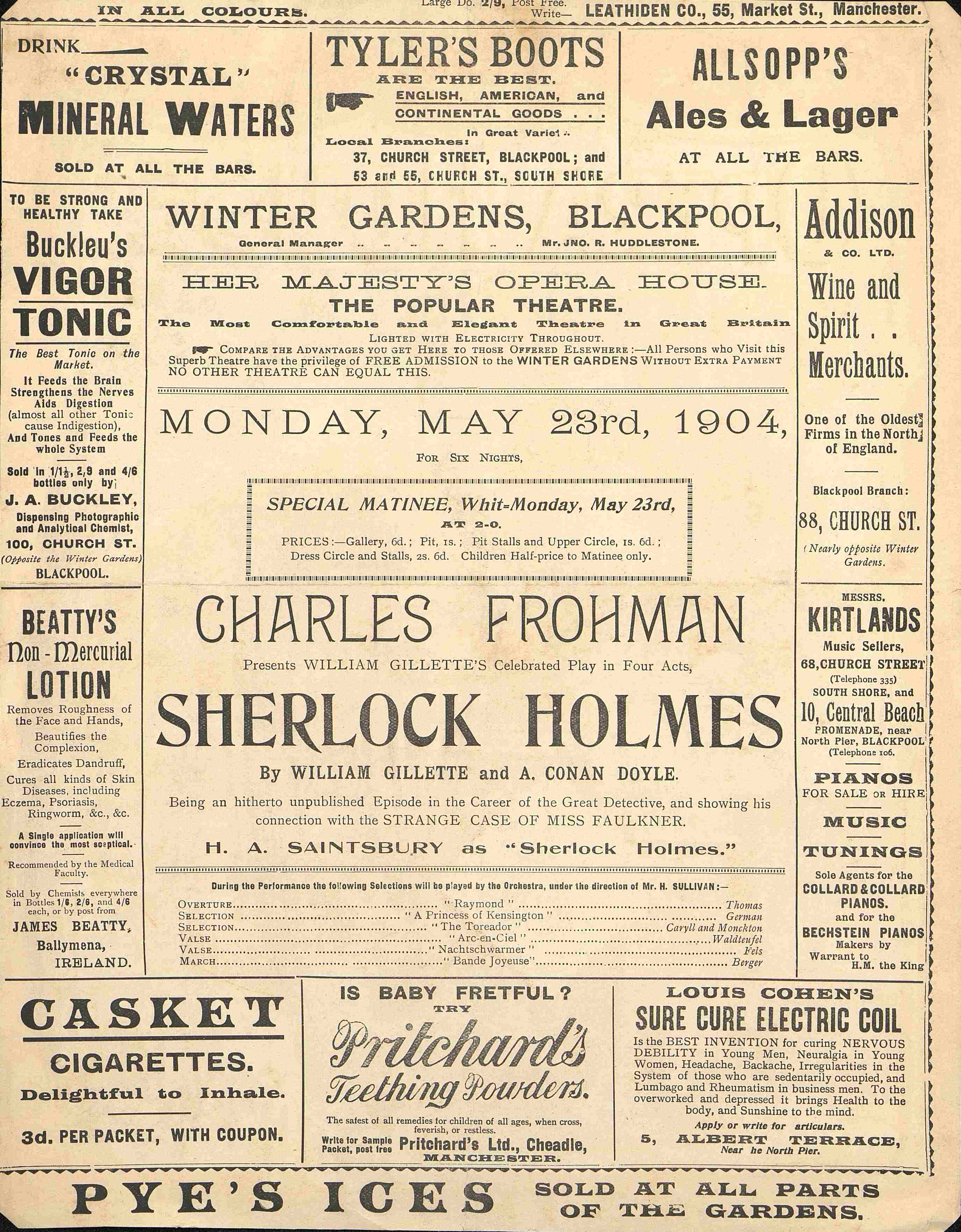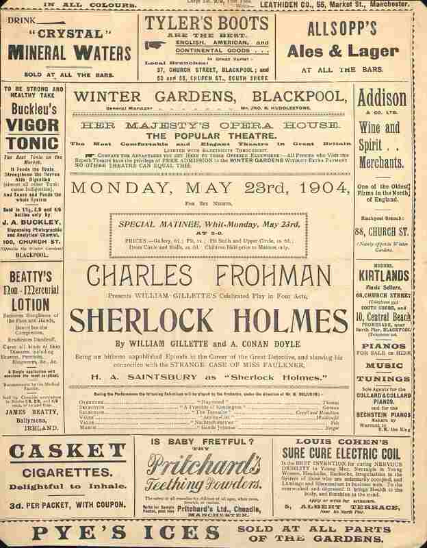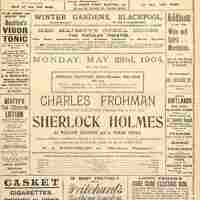 Programme partiel de l'Opera House Winter Gardens présentant l'adaptation scénique du Sherlock Holmes par son auteur Conan Doyle et l'acteur Charles Frohman. Daté du 23 may 1904. Nombreuses publicités.