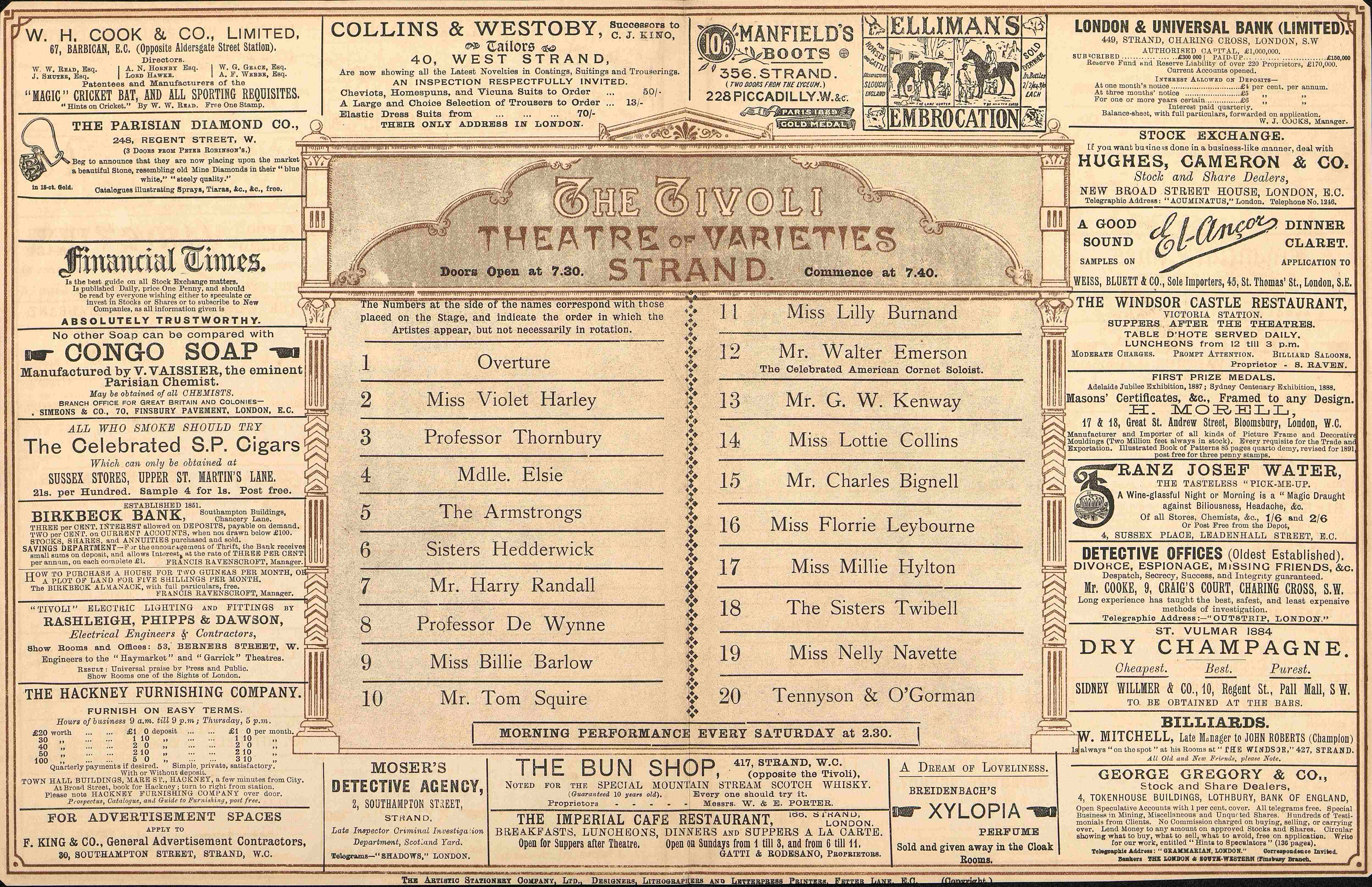 Programme du Tivoli, Theatre and varieties sur The Strand à Londres. Nombreuses publicités encadrant l'ordre d'apparition des artistes.
