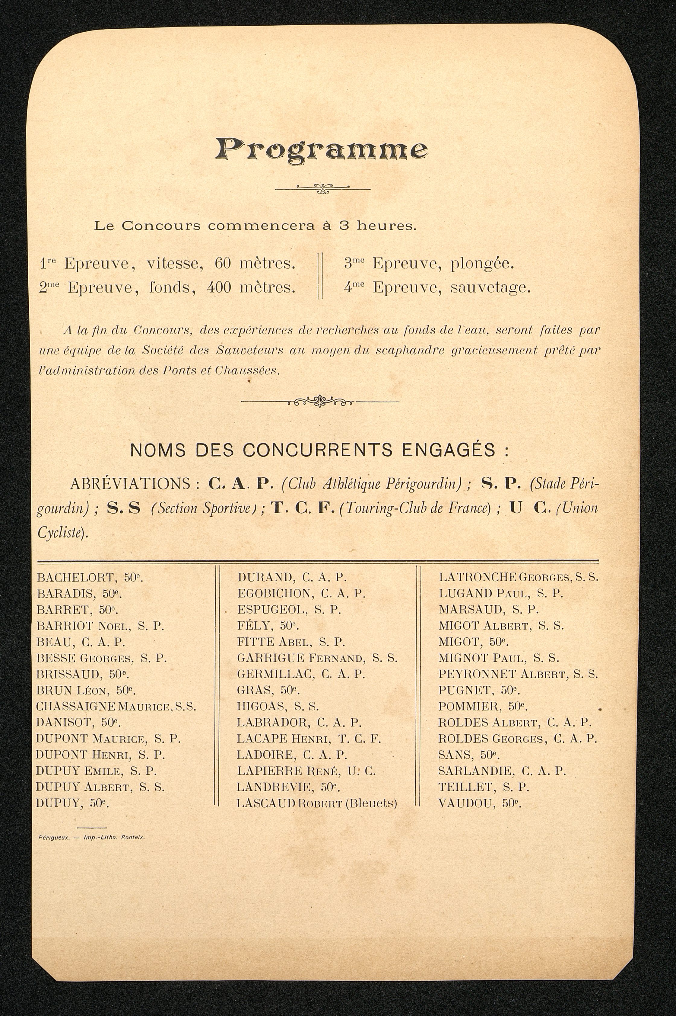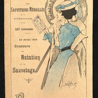 Document illustré de la Société des Sauveteurs Médaillés de la Dordogne. XXVe anniversaire du 23 juillet 1905. Concours de natation et de sauvetage.