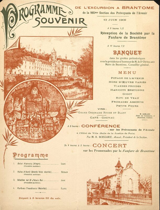 Programme : A 9:30 h Réception de la Société par la Fanfare de Brantôme. A 11:3O Banquet dans les grottes préhistoriques sous la présidence d'honneur de M. le Dr Duvillard Maire de Brantôme, Conseiller général. 15:00 h Conférence sur les Prévoyants de l'Avenir à l'Hôtel de Ville Salle de la Justice de Paix par M. R. Boissarie, Avocat, Président de la Section. De 16:00 à 17:00 h. concert sur les Promenades par la Fanfare de Brantôme. Départ à 17:35 h.