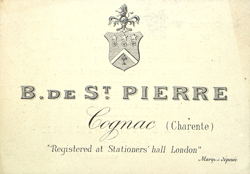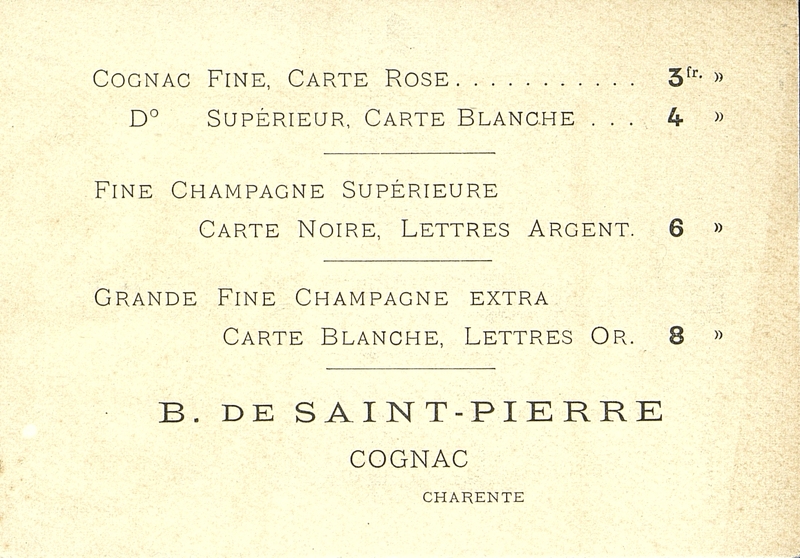 Carte publicitaire du Cognac, B. de St-Pierre, avec au dos de la carte les tarifs.