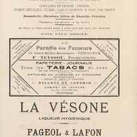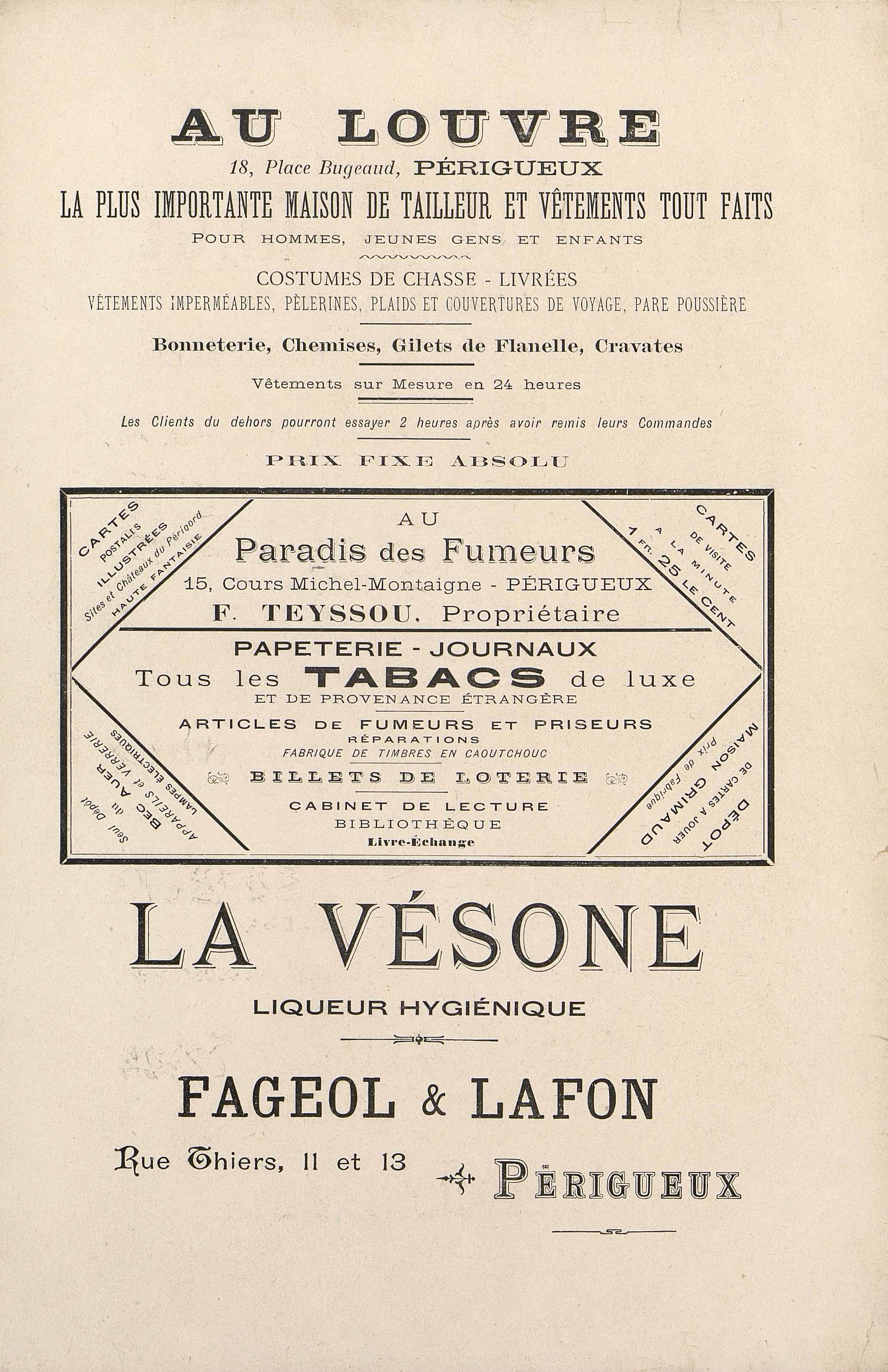 Publicités commerciales : Au Louvre 18, Place Bugeaud à Périgueux. Au Paradis des Fumeurs 15 Place Michel-Montaigne R. Teyssou. La Vésone : liqueur hygiènique chez Fageol et Lafon 11 et 13 Rue Thiers à Périgueux.