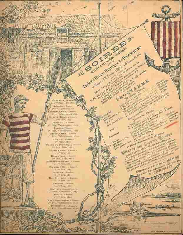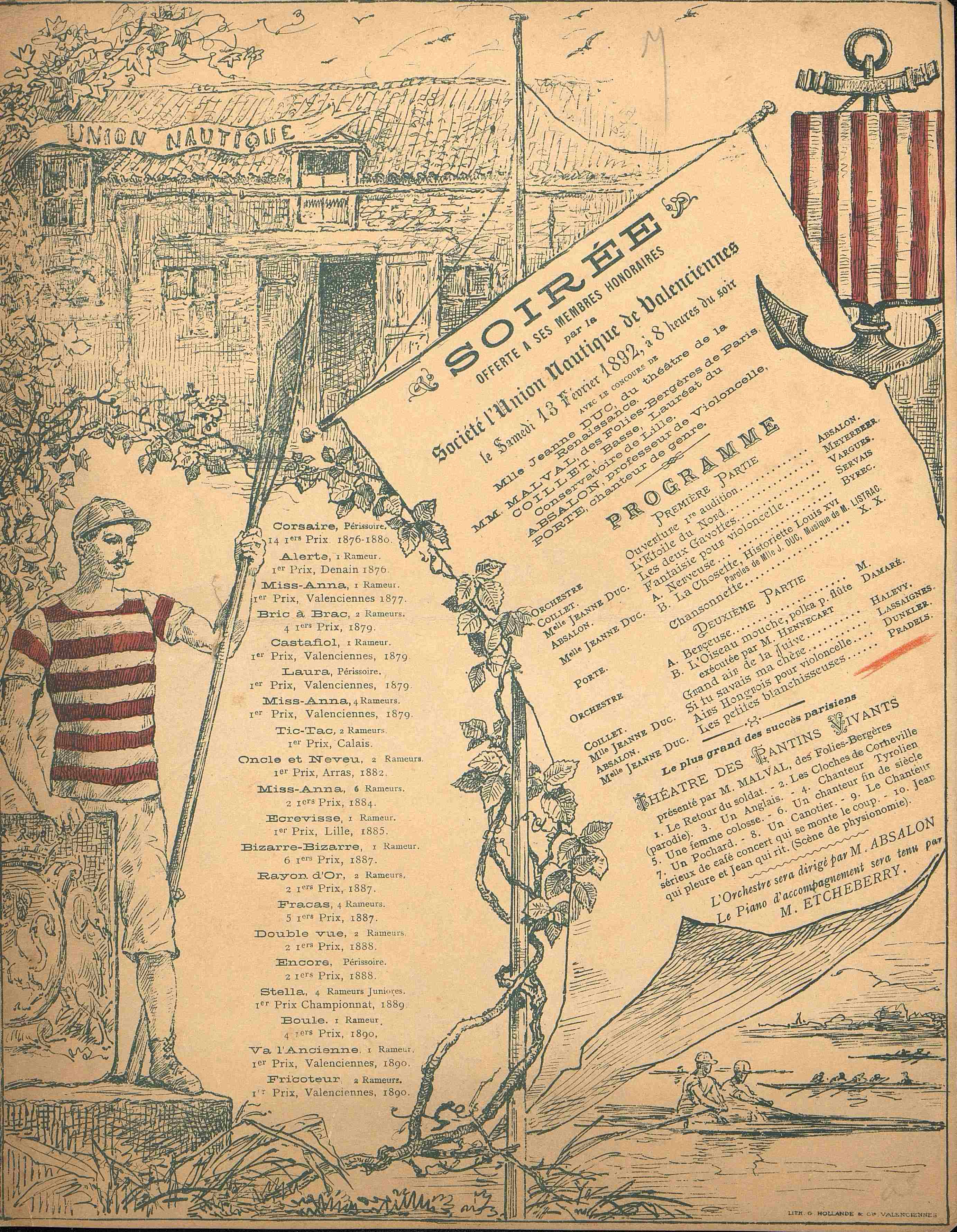 Soirée offerte par la Société l'Union Nautique de Valenciennes avec un programme musical. Le document comporte une liste de bateaux ayant ou participant à ces régates. participation du Théâtre des Pantins Vivants. à ces festivités.