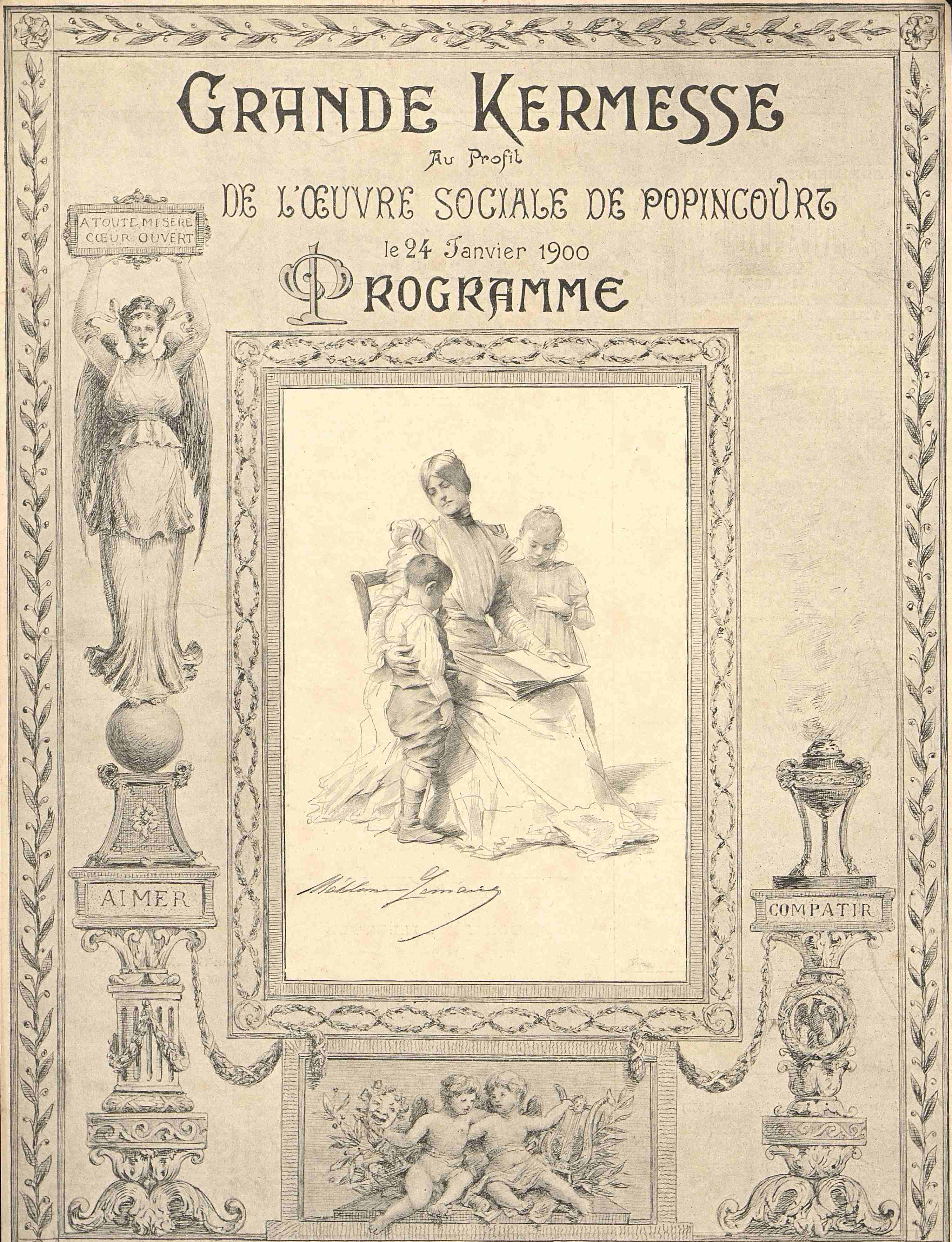 Programme extrait d'une revue : Grande Kermesse de l’Œuvre Sociale de Popincourt. Daté du 24 janvier 1900. Décor néo classique avec Putti et déesse ailée. "A toute misère cœur ouvert. Aimer. Compatir". Madelaine Lemaire .