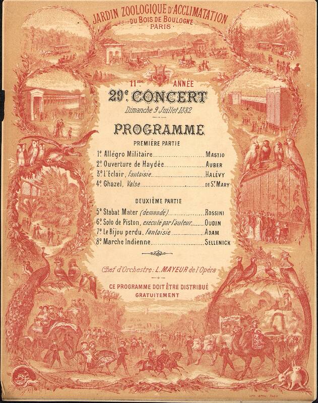 Programme Musical du 29e concert au Jardin zoologique d'acclimatation du Bois de Boulogne. Dimanche 9 juillet 1882. Document illustré, distribué gratuitement. Au dos des publicités.