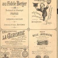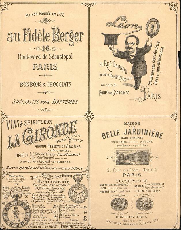 Verso publicitaire : Au Fidèle Berger ; Léon ; La gironde, Vins et Spiritueux ; Dépôt Général d'Horlogerie ; Maison de la Belle jardinière.
