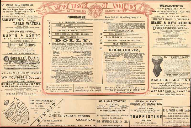 Programme illustré et pliant du Empire Theatre of Varieties à la date du 30 mars 1891. Nombreuses publicités accompagnant ce programme.