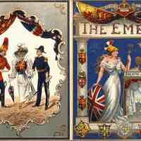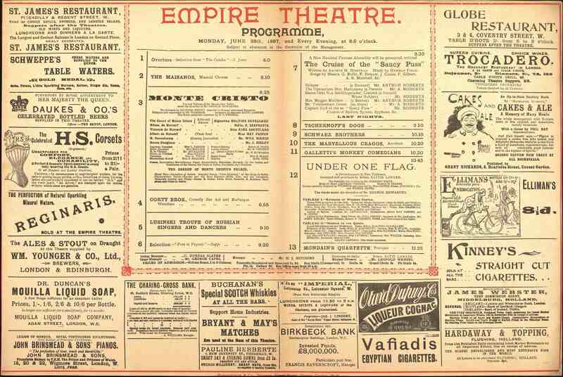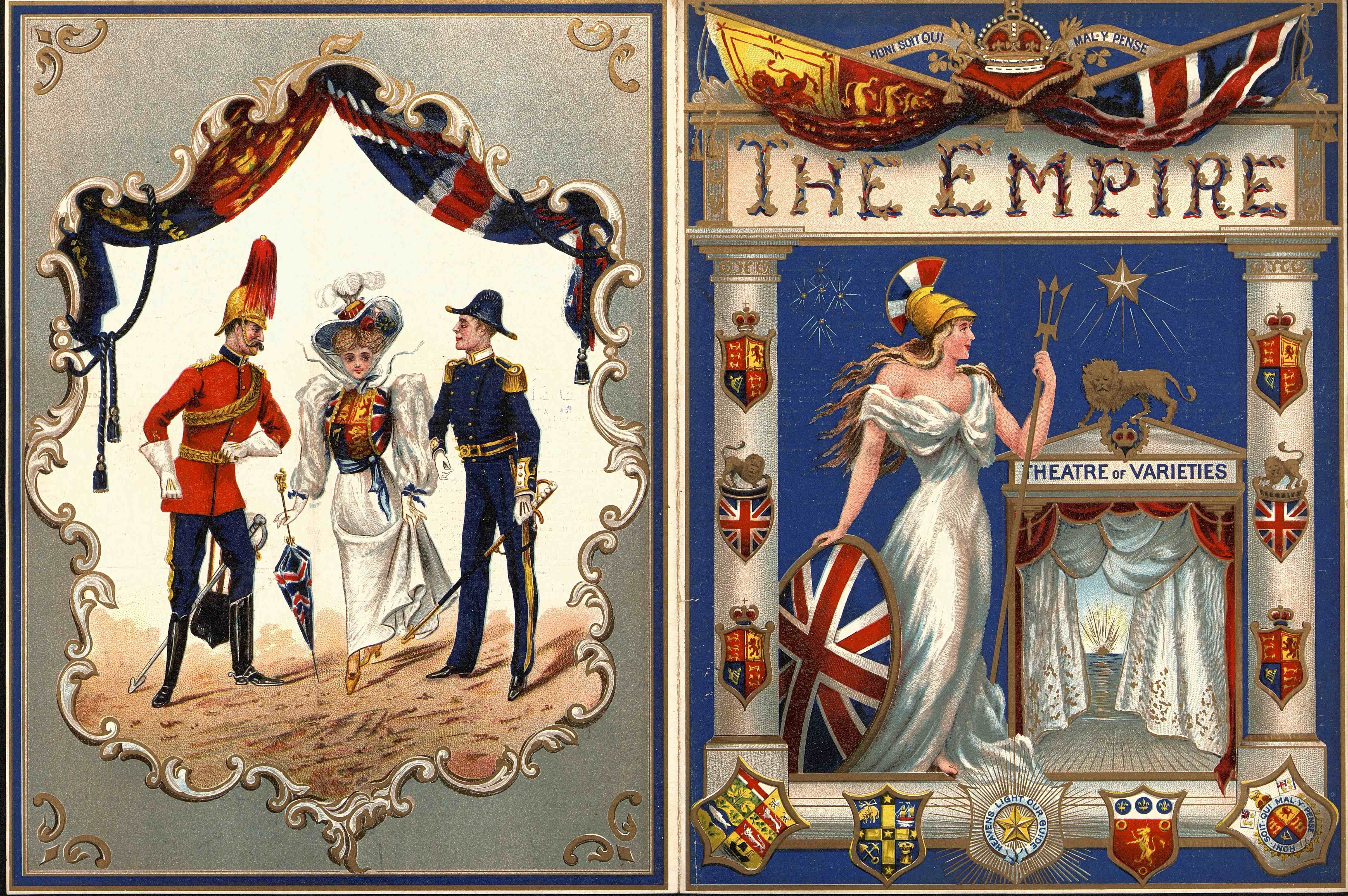 Dépliant programme de The Empire, Theatre of varieties à Londres. Nombreuses publicités accompagnant les spectacles datés du 28 juin 1897. Blasons d'Angleterre.