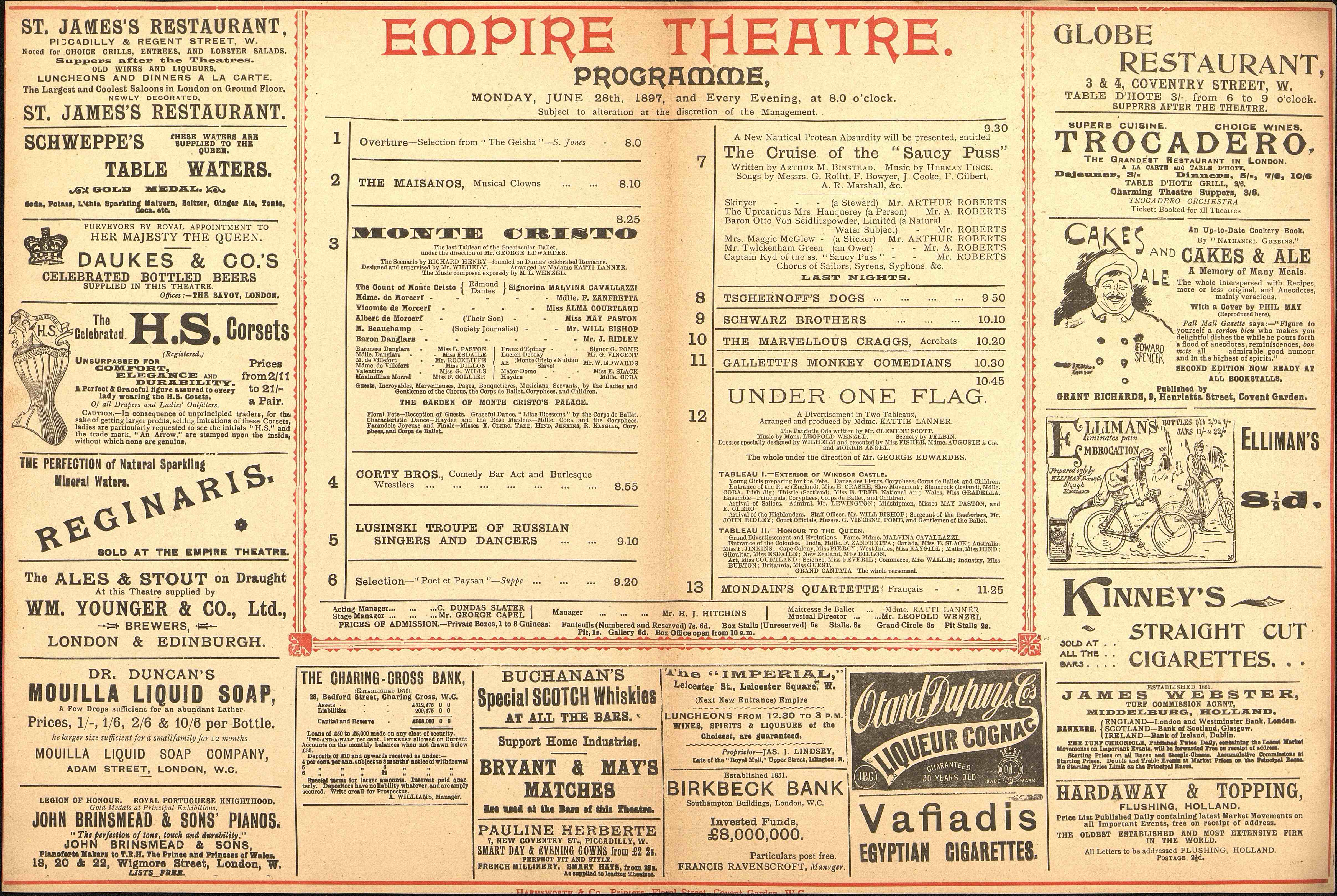 The Geisha ; The Maisanos, musical clowns ; Monte Christo, ballet ; Corty Bros ; Lusinski, russians singers and dancers ; Poet et Paysan ; The cruise of the "Saucy Puss" ; Tschernoff's dogs ; Scharz brothers ; The Marvellous Craggs, acrobats ; Galletti's Monkey Comedians ; Under one Flag, divertissement ; Mondain's Quartette.