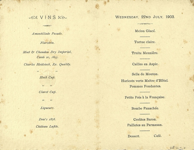 Plats servis : Melon glacé. Tortue claire. Truite Meunière ; Cailles en Aspic. Selle de Mouton. Haricots verts Maître d'Hôtel. Pommes Fondantes. Petits Pois à la Française. Bombe Panachée. Croûtes Baron. Pailletes au Parmesan. Dessert. Café.